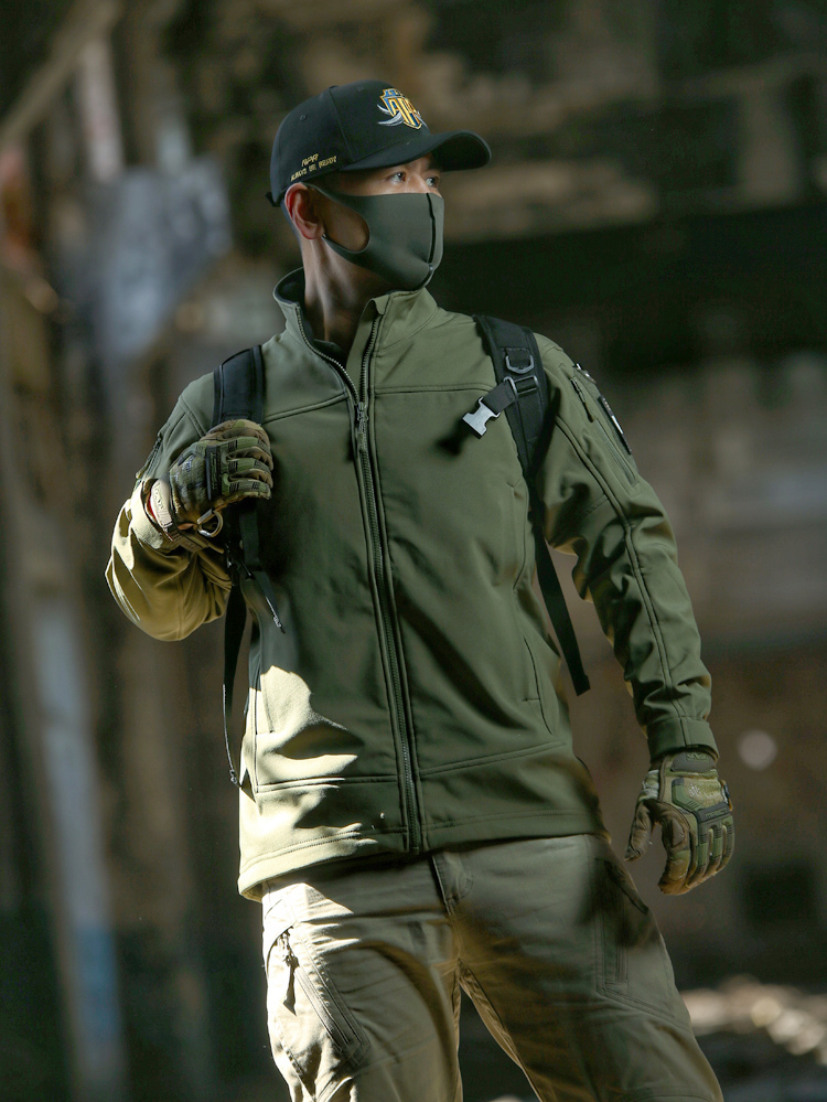 OYO设计的这款户外小众设计战术软壳夹克,一款带有粗犷高的男士保暖外套,搭配同样色系的战术裤子,运动灵活自如,搭配高帮战术靴子,立显男子汉的硬朗的风格。