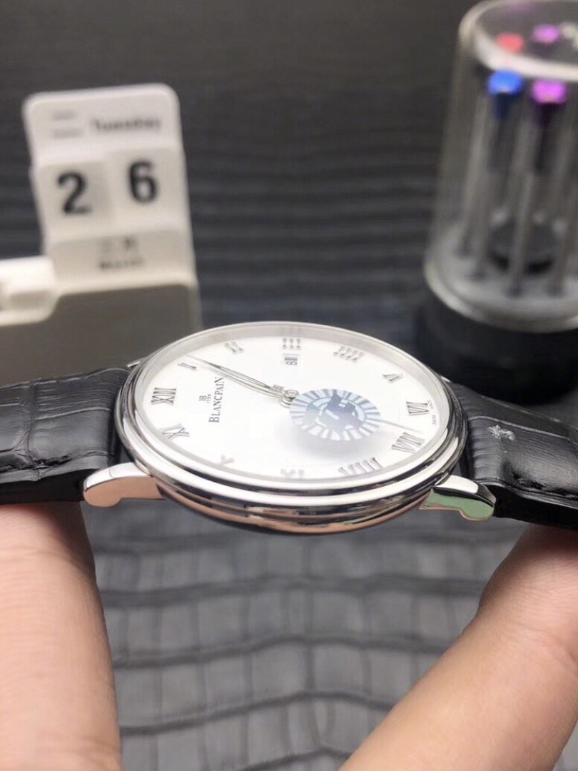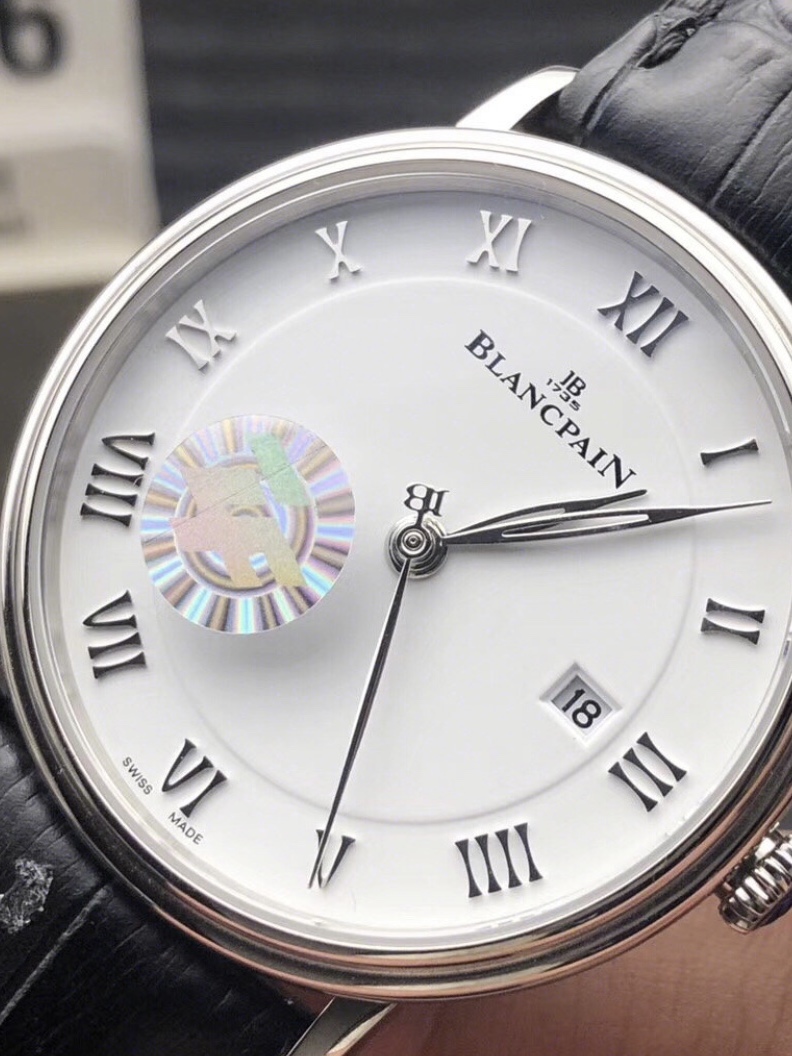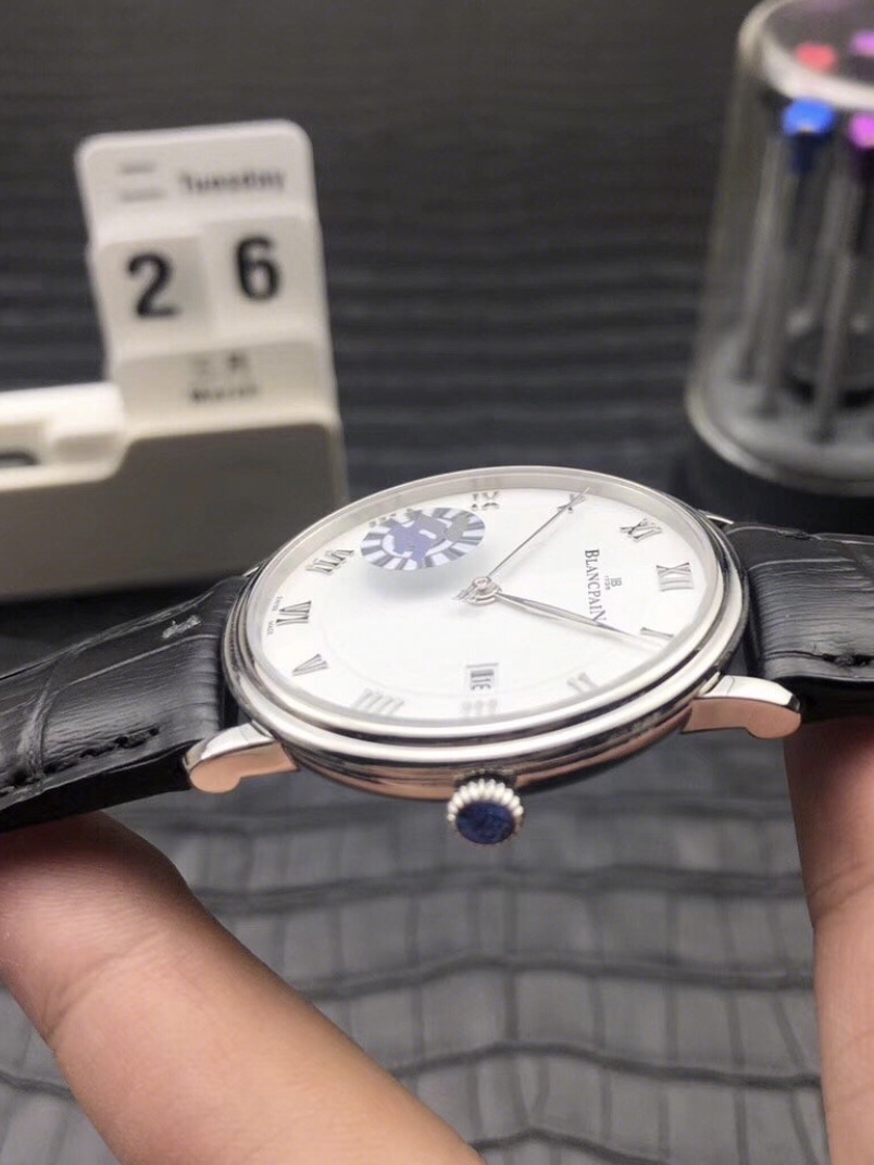 表盘设计非常简单,白色的底色加上黑色的罗马数字,经典不过时,搭配黑色的皮质表带,很高级的质感,表盘大小也刚刚好,适合各种手腕粗细的男生。上手也很舒适。