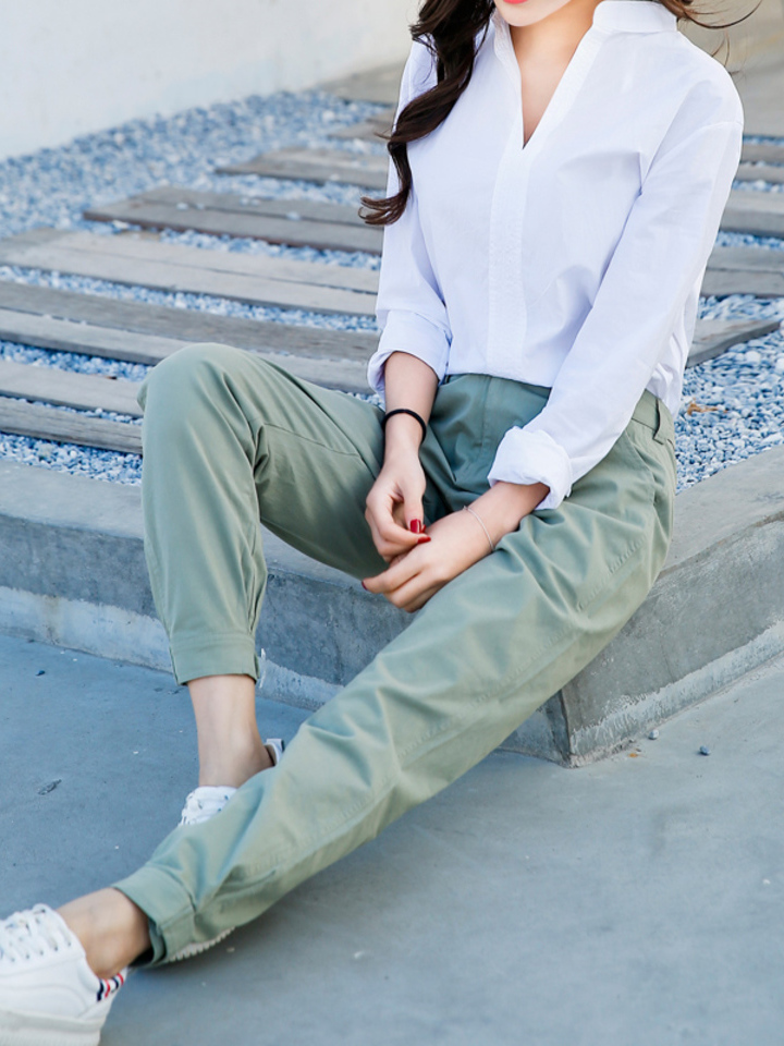 简约的高腰设计,搭配上修身的版型,上身显瘦又显高。