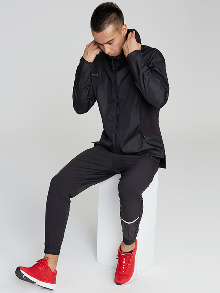 连帽版型剪裁的运动套装,时尚美观尽显运动风格。脚下搭配红色的运动鞋,看起来活力四射,凸显青春格调。