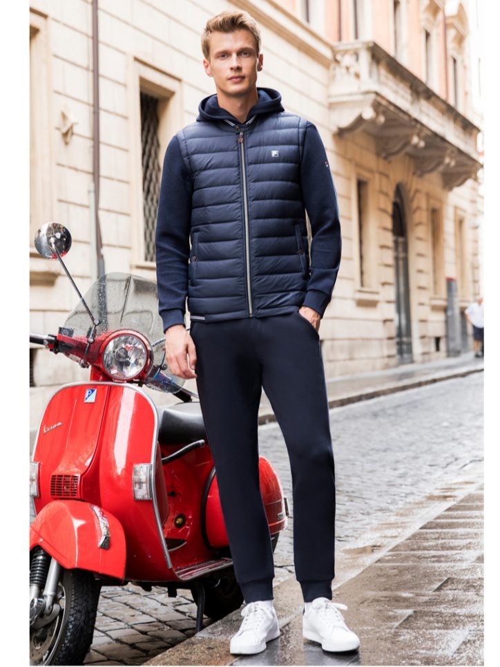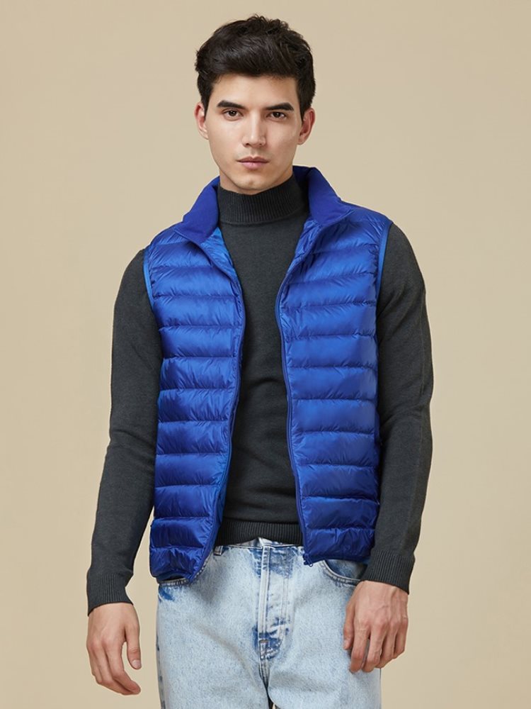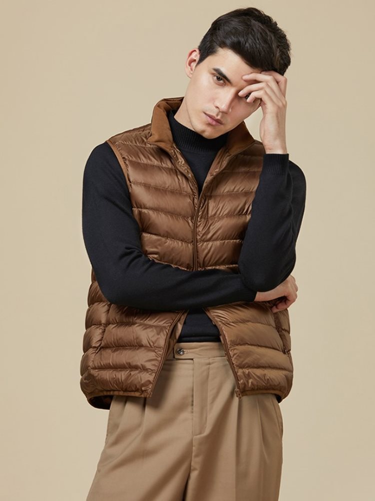 一款简单大方的羽绒马甲,对身材也没有 太多限制,袖口稍微宽松,不勒胳膊,温暖舒适。内搭连帽卫衣,下半身穿深色运动裤,整个人看起来非常有阳光。
