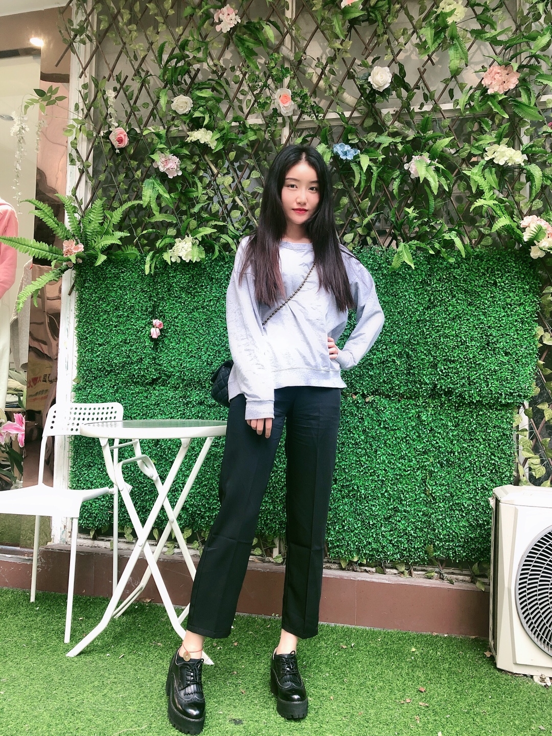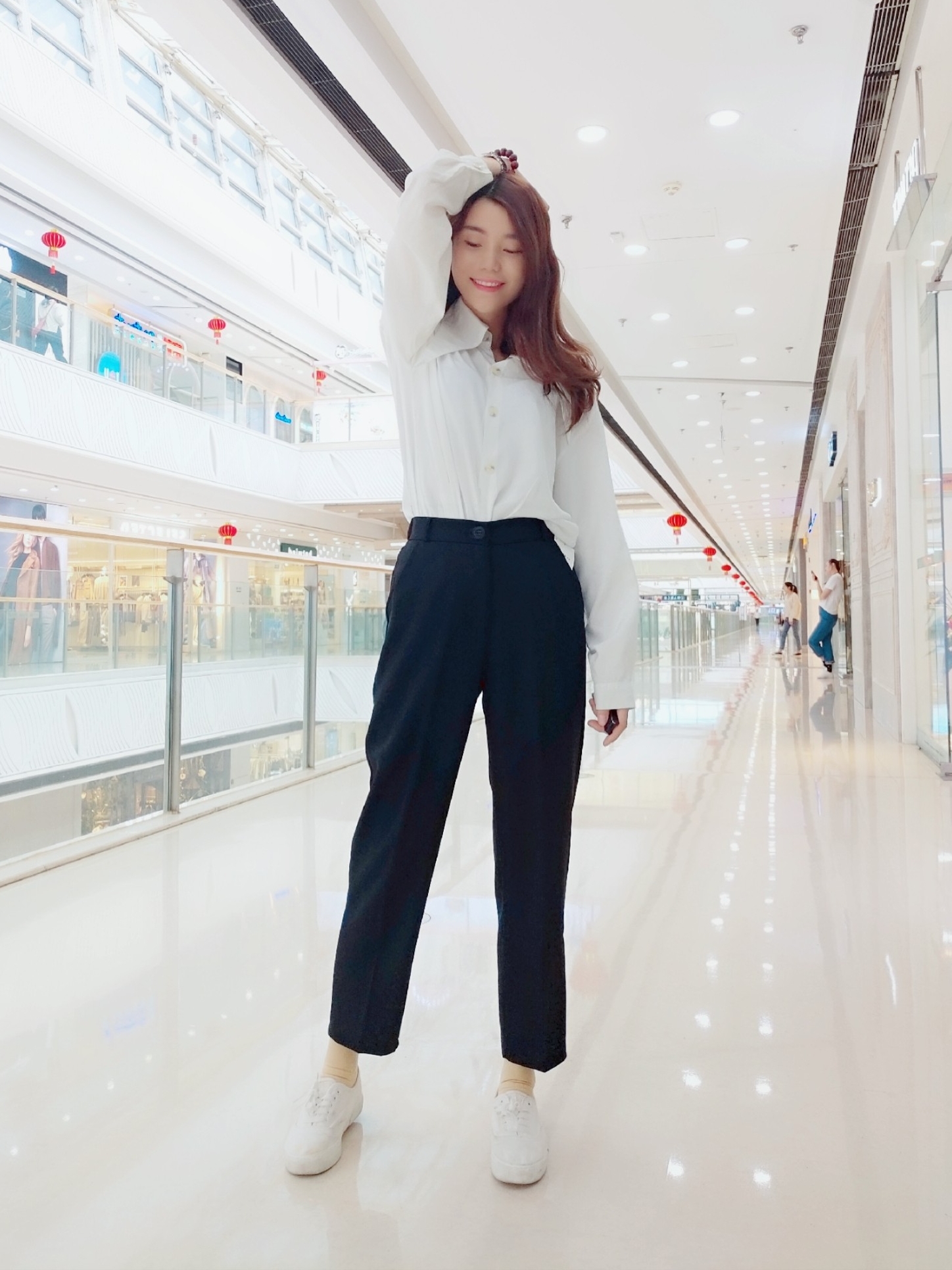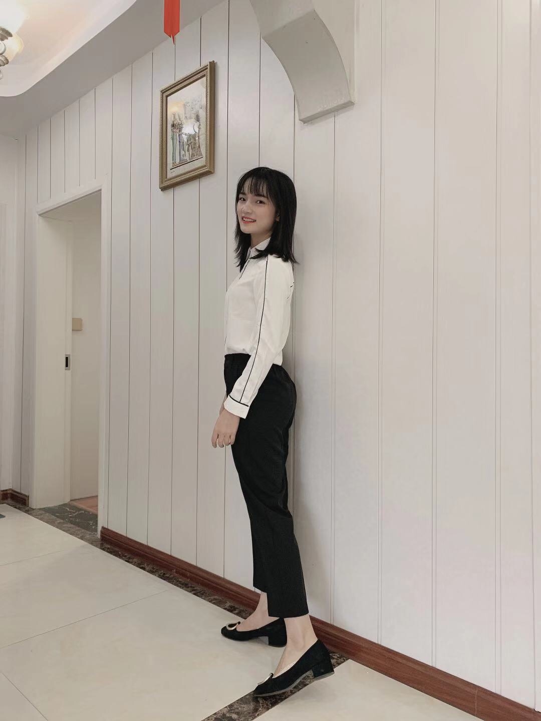 高腰的设计,拉长腿部线条,显瘦效果很好,高腰的版型,很显高挑,修身的剪裁,修饰腿部曲线,上身很有范。