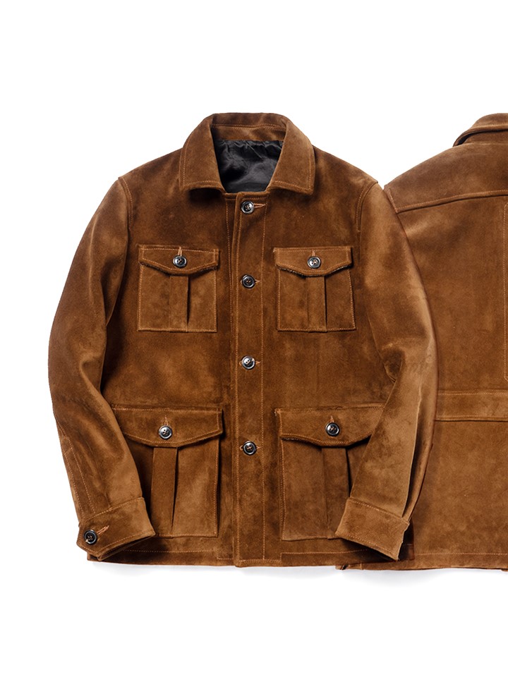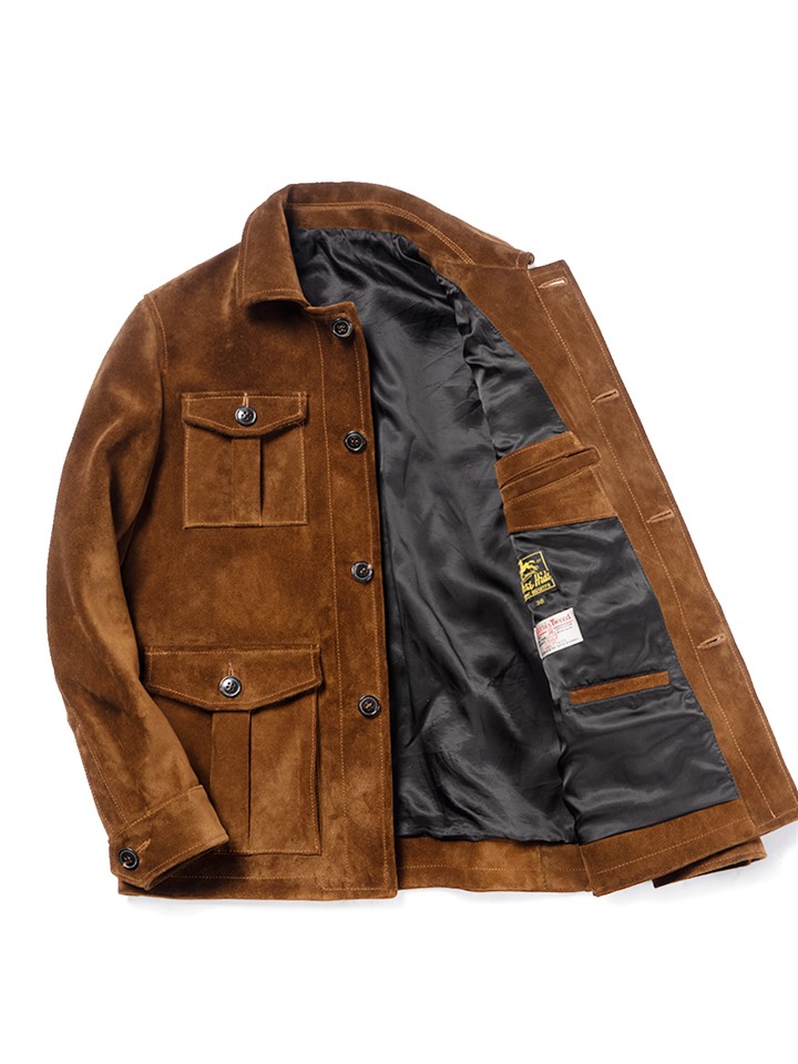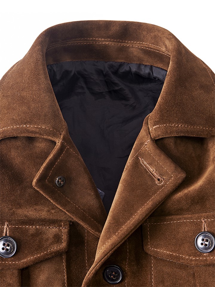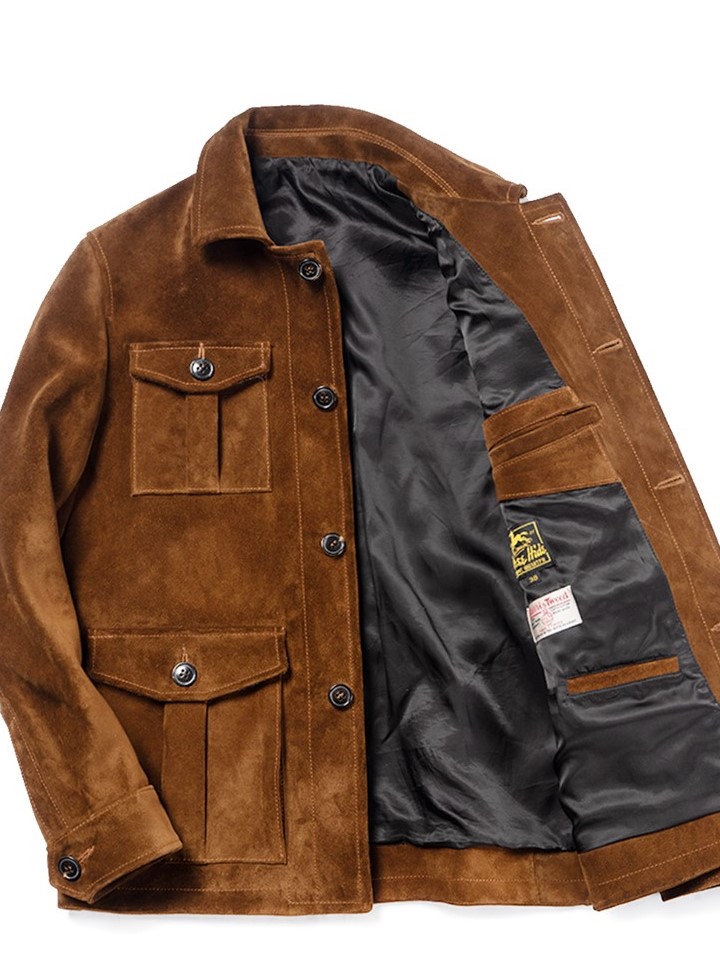 翻领设计,彰显男士魅力,皮衣版型,穿着帅气有型,反绒面料,触感柔软舒适,多口袋设计,美观又实用。