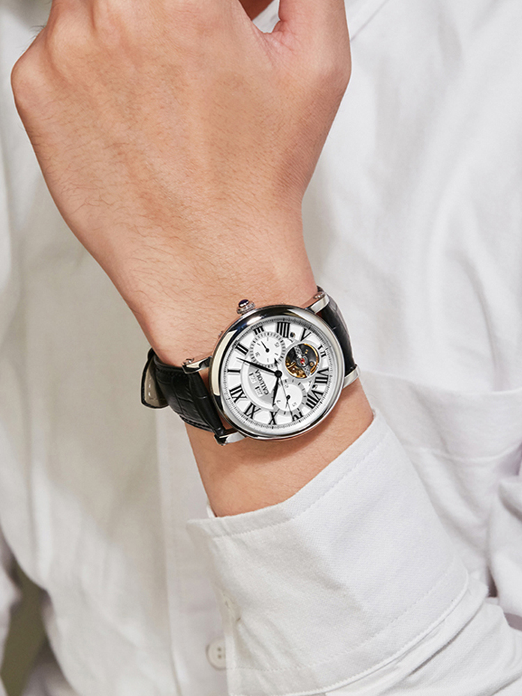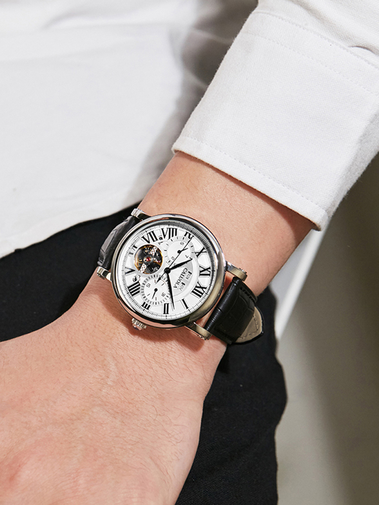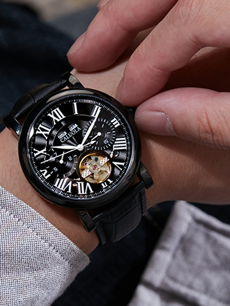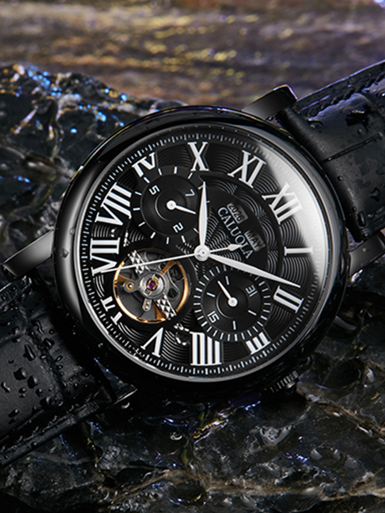 瑞士手表品牌CALUOLA/卡罗莱精心打造,采用进口原装自动机械机芯;表盘面漩涡纹理的设计,充满视觉美感,让人沉醉其中;条钉刻度与细长指针的撞色设计,极具层次感,使表盘更加立体化。