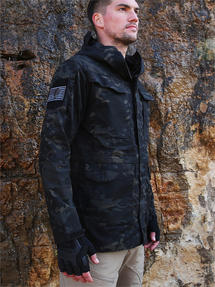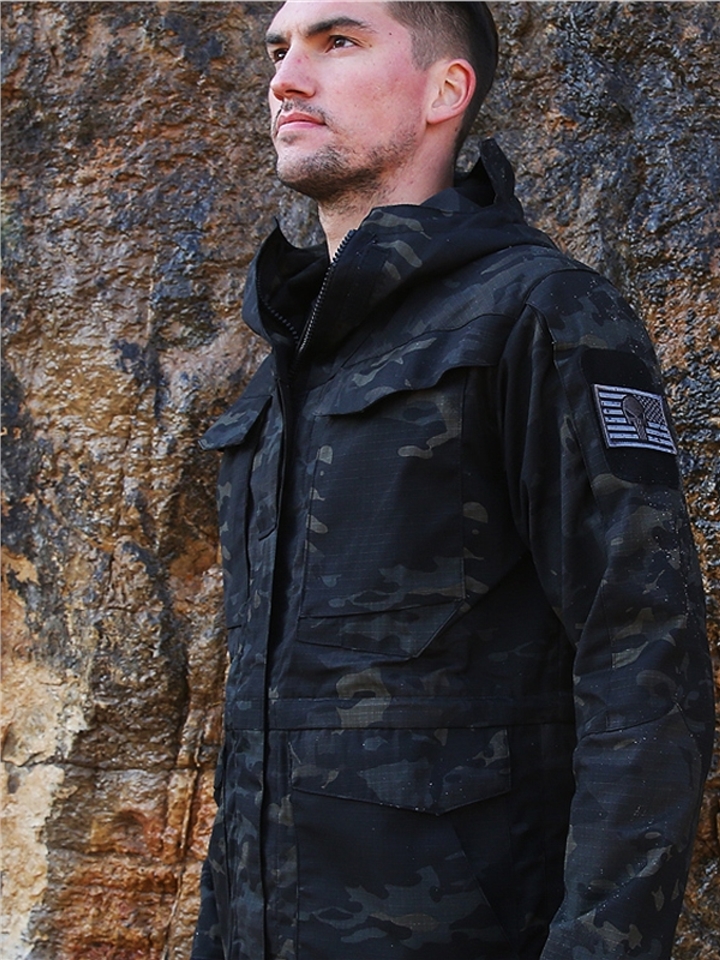 100%聚酯纤维的材质。冲锋衣版型,时尚感十足。中长款版型,穿着更舒适。