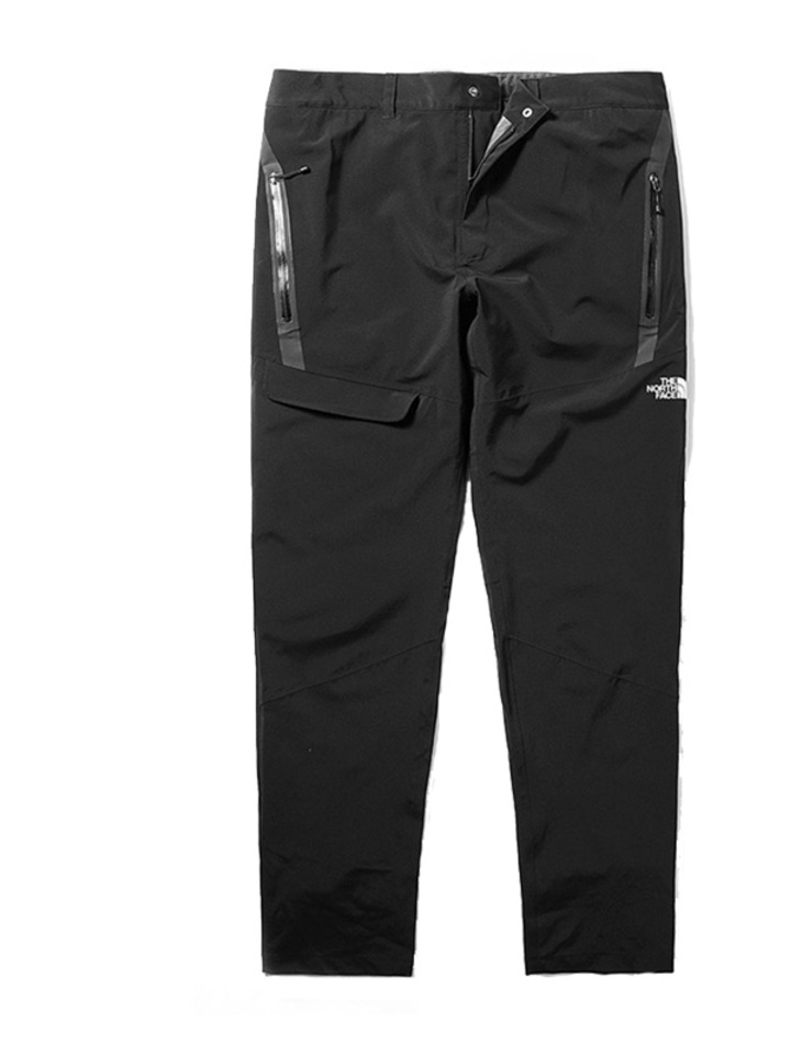 直筒型男士户外长裤,腰围采用半开拉链系扣式,并配有搭配腰带的腰环,口袋处以铆钉装饰固定,腿部立体裁剪,膝盖处走线进行立体缝合,保证膝盖活动自如。