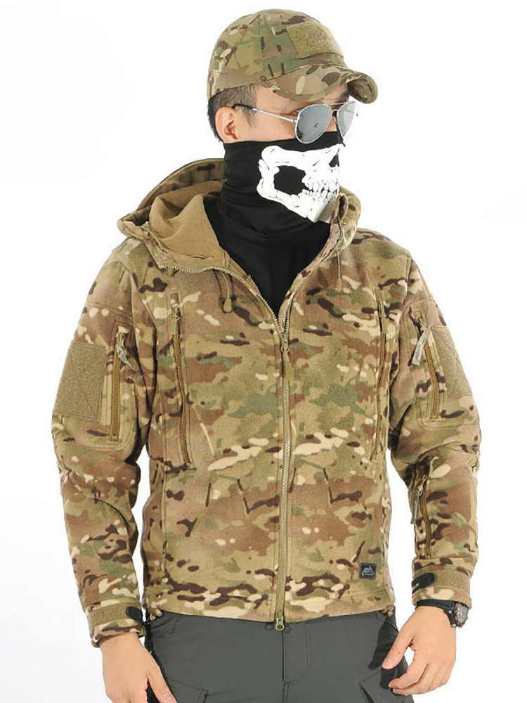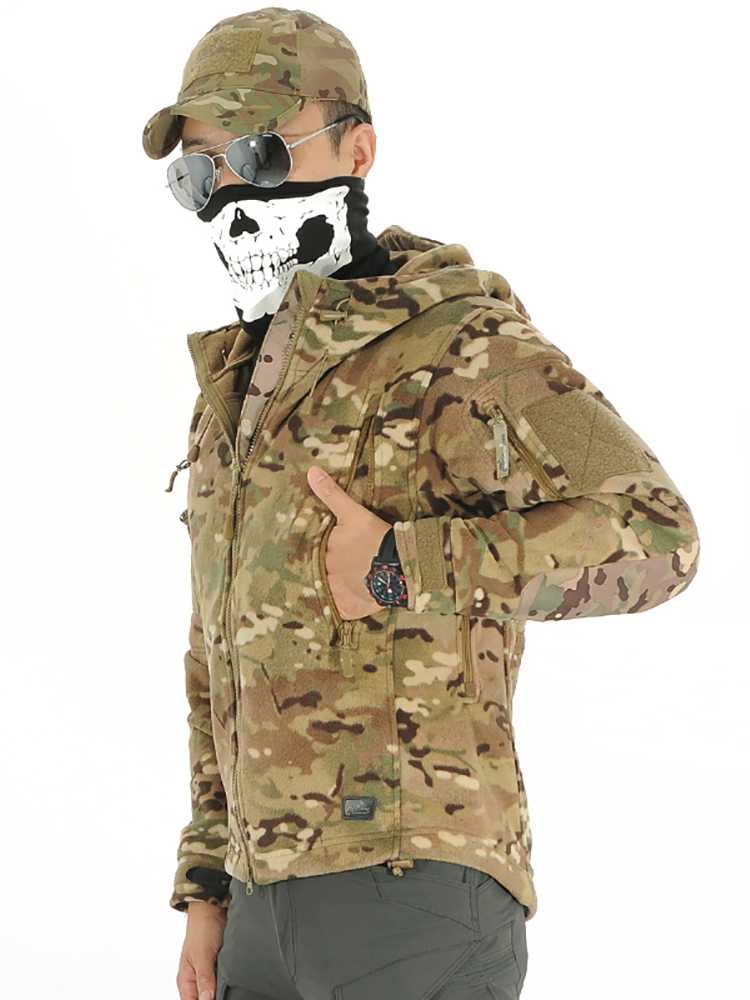在迷彩元素大肆流行的今天,这款外套让穿着效果具有硬朗和带有一定的军事气息。两侧插手口袋,满足置物需求。连帽结合拉绳的设计,可让穿着更具立体感。