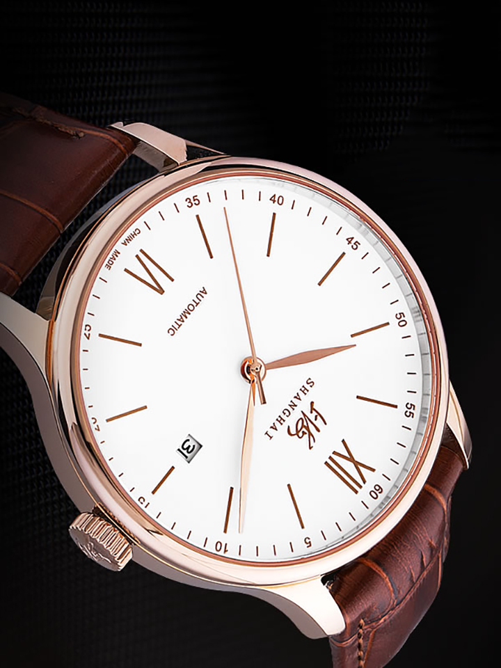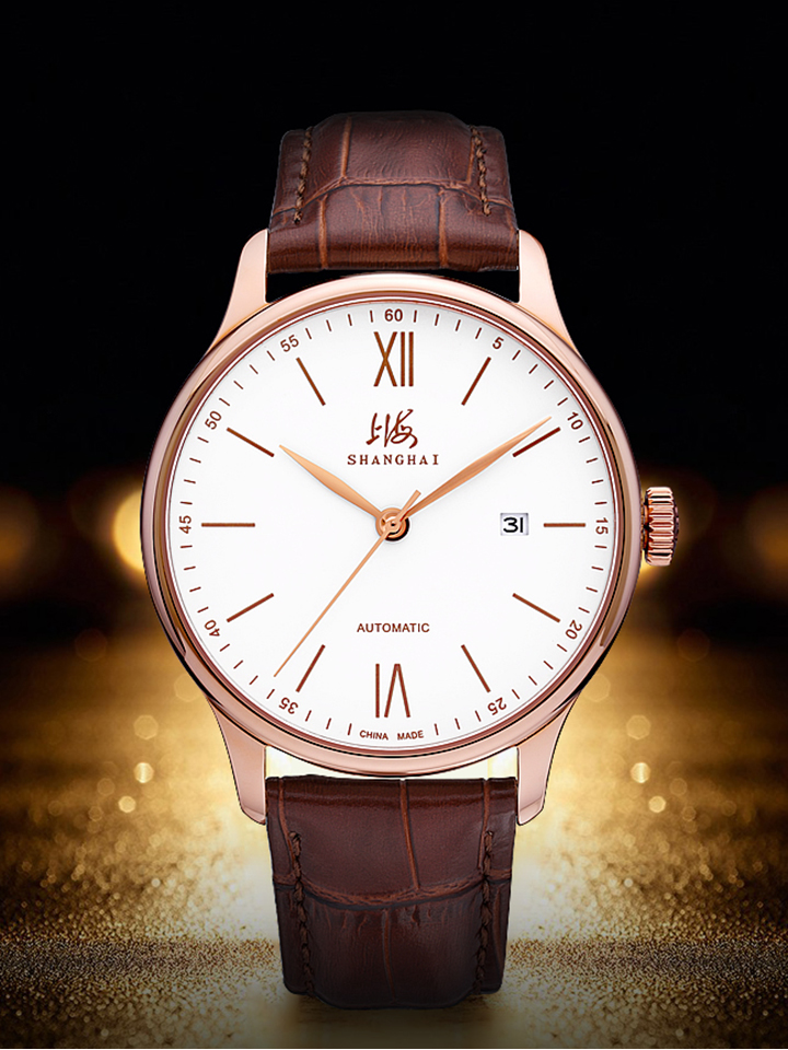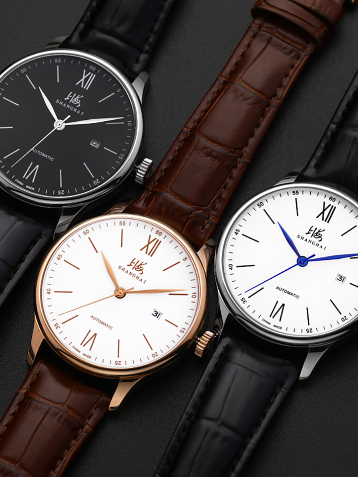 这个手表有着经典的条形刻度,搭配柳叶型指针,罗马大刻度,时尚大方,历经124道工序锻造316l实心精钢,雕刻光泽度非常好,简约的表盘设计和老上海的logo相呼应,展现了古典优雅的美。