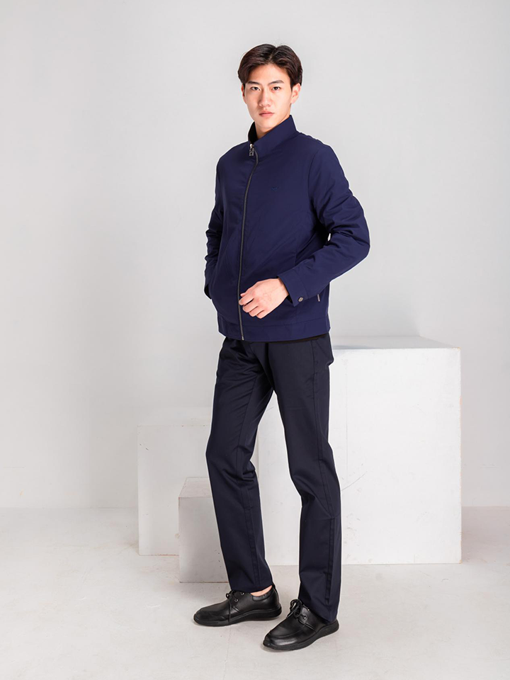 因为夹克为深蓝色的渲染,所以我选择用黑色的长裤来搭配,同样的深色系沉稳内敛,还能显高显瘦,让身材看起来更加高挑修长。夹克短款的衣身凸显腰线,让身体比例看起来更加协调。长裤直筒的版型修饰腿型,勾勒出修长笔直的双腿。再搭配双黑色的皮鞋,舒适便捷,与黑色的长裤衔接,简化搭配颜色。无论是日常还是正式场合穿着都很适合。