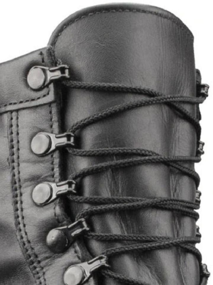 C.Q.B超酷的高帮军靴,专为军迷设计的户外作战靴,鞋面采用了光面头层牛皮材质,鞋头与鞋跟出加入特别的耐磨处理,适合户外作训环境,一体式鞋舌设计,加入双列透气网布,进一步提升透气效果,高帮设计,包裹双