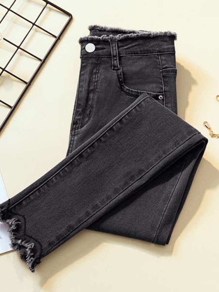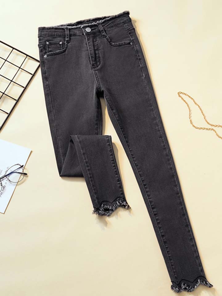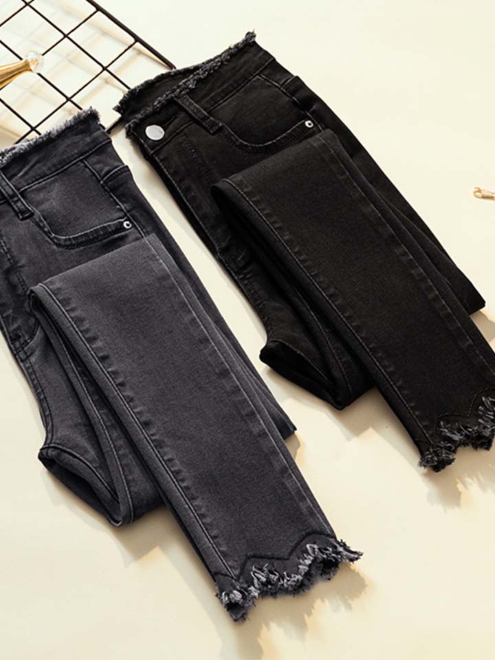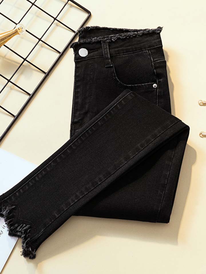 充满街头风的黑色牛仔裤,裤侧边的毛边装饰设计是很不错的,带来了更加不一样的效果,而且裤脚处的处理也是很时尚的。