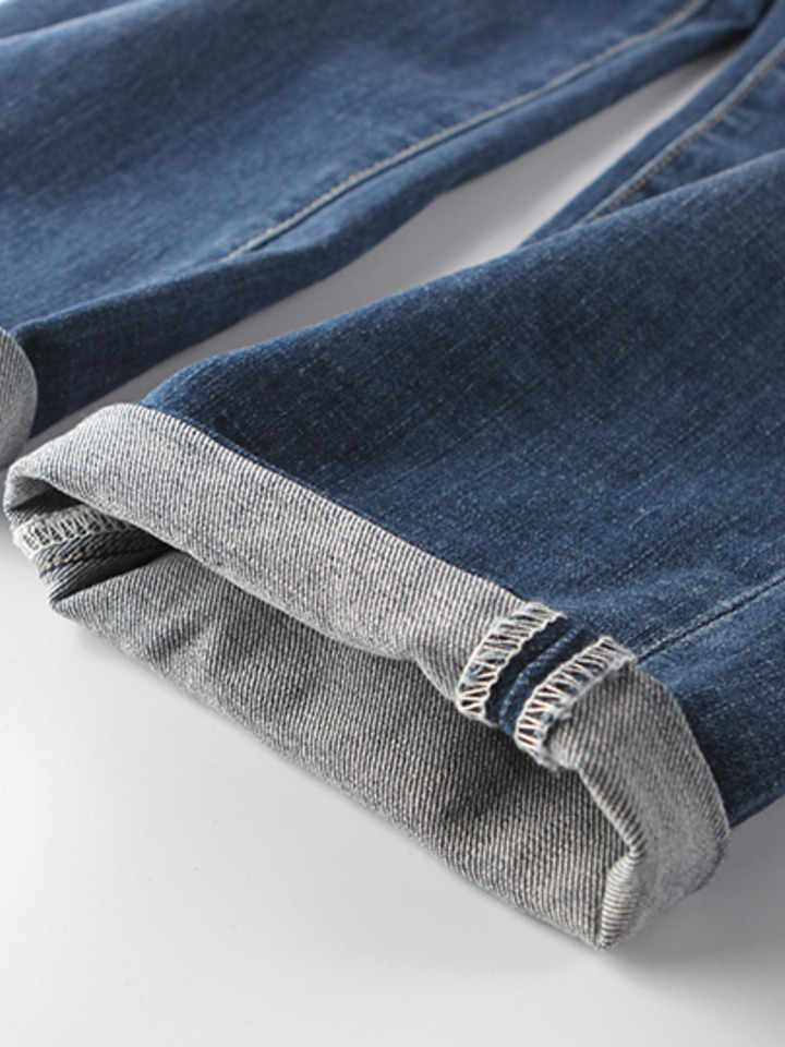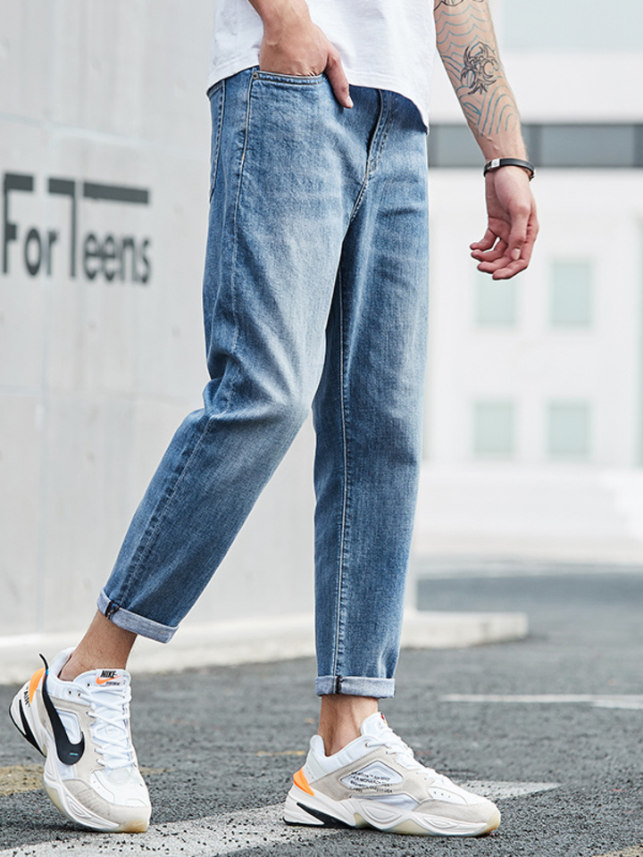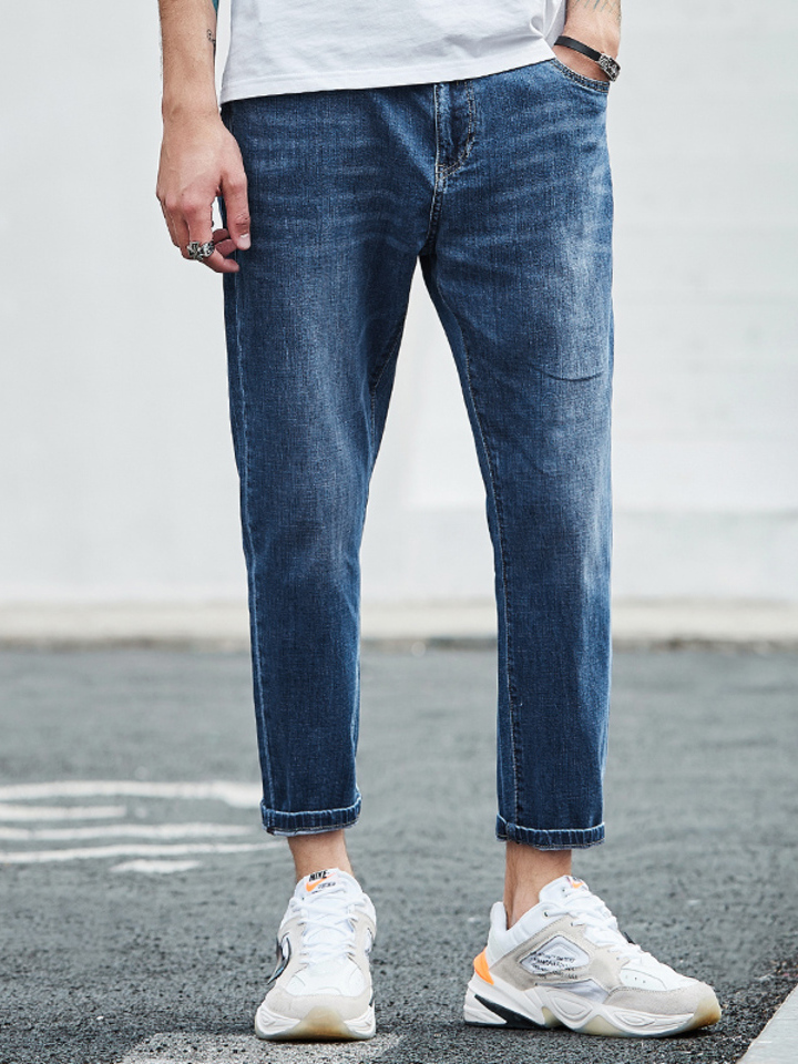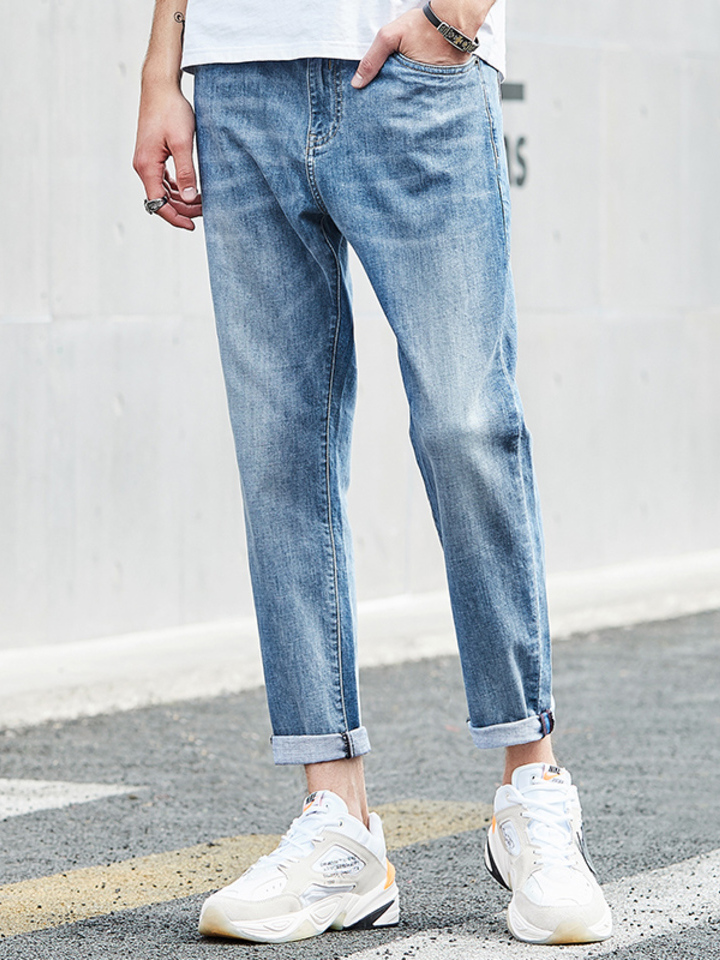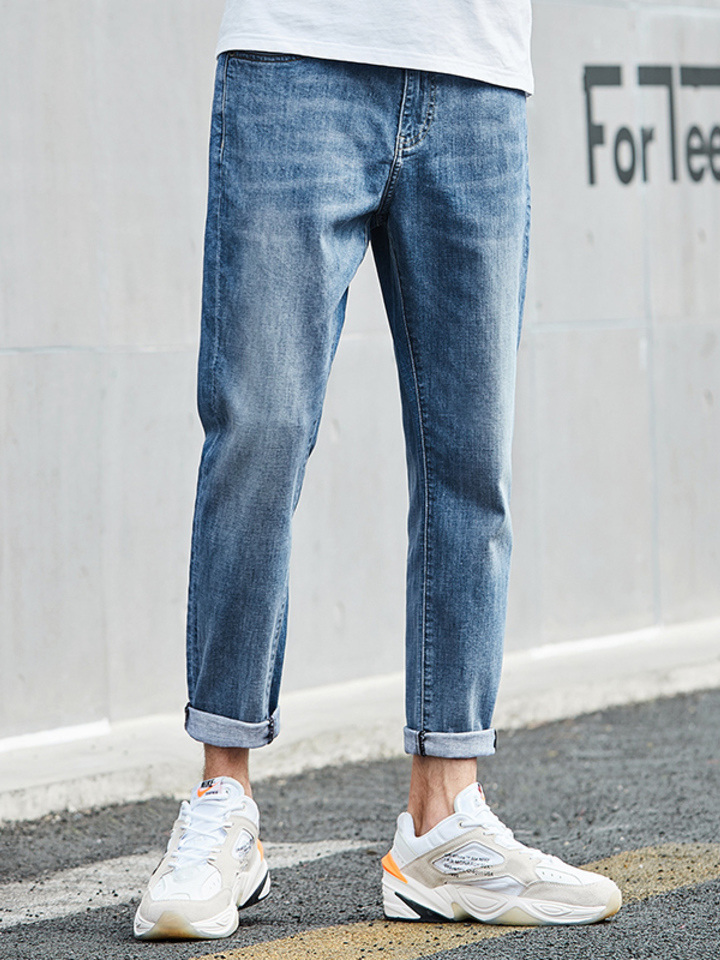 休闲百搭是此款男士牛仔裤的亮点之一,甄选上乘材质加上精湛的水洗工艺制作使得穿着舒适自然,斜插口袋与后贴布口袋相呼应,彰显经典时尚,修身的版型搭配小裤脚收口,时尚不失有型。