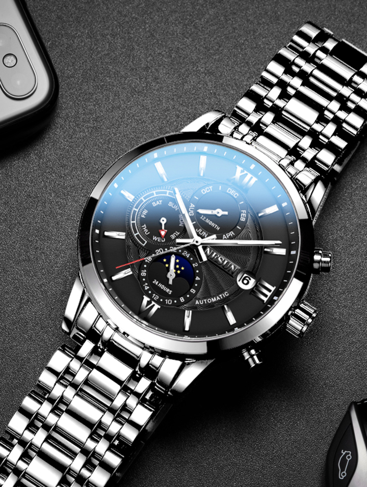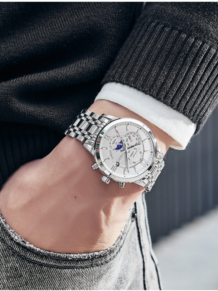 特别的精钢金属线条让手表极具质感,精致的立体刻度,为腕间平添些许儒雅的气息。