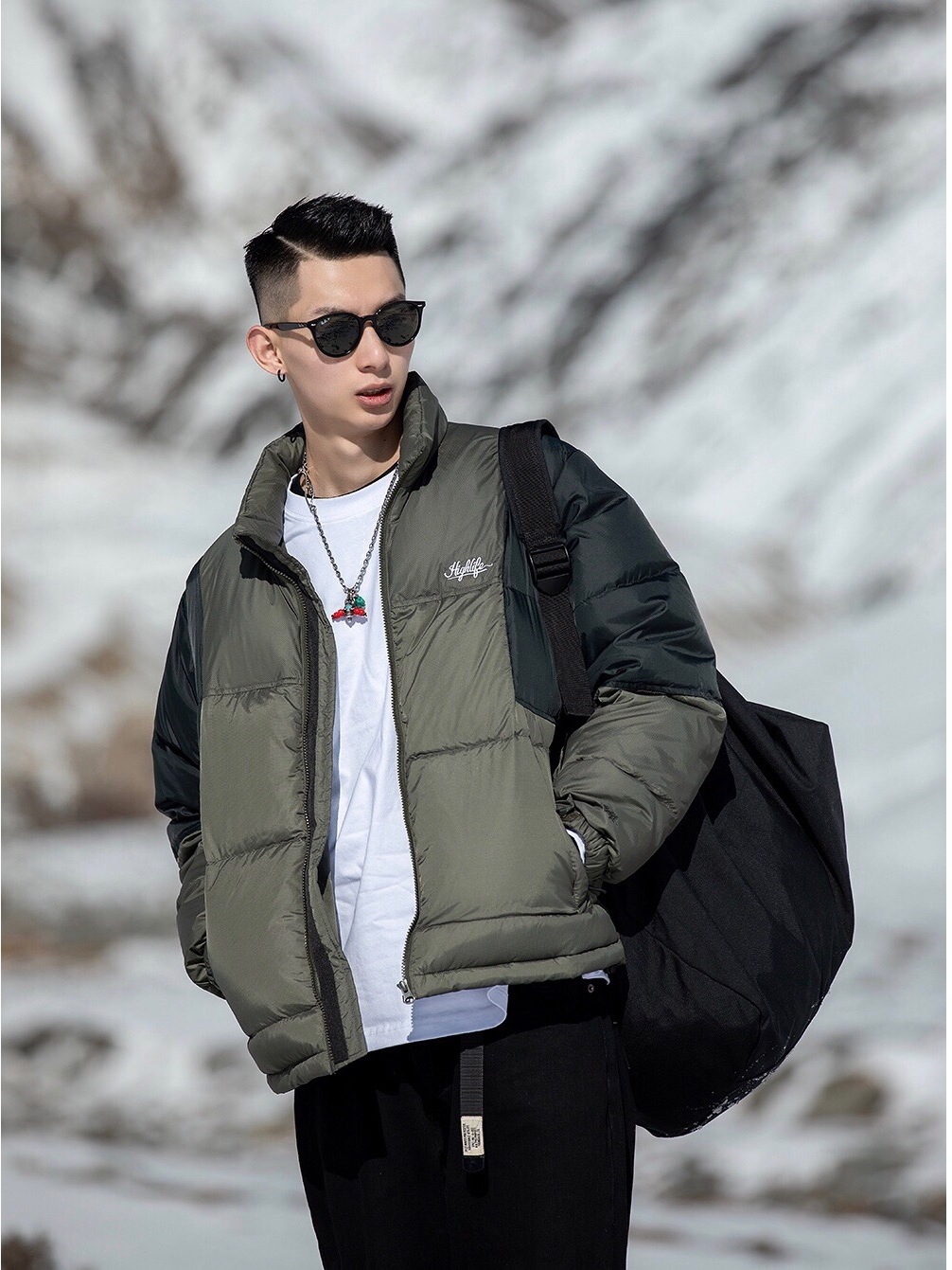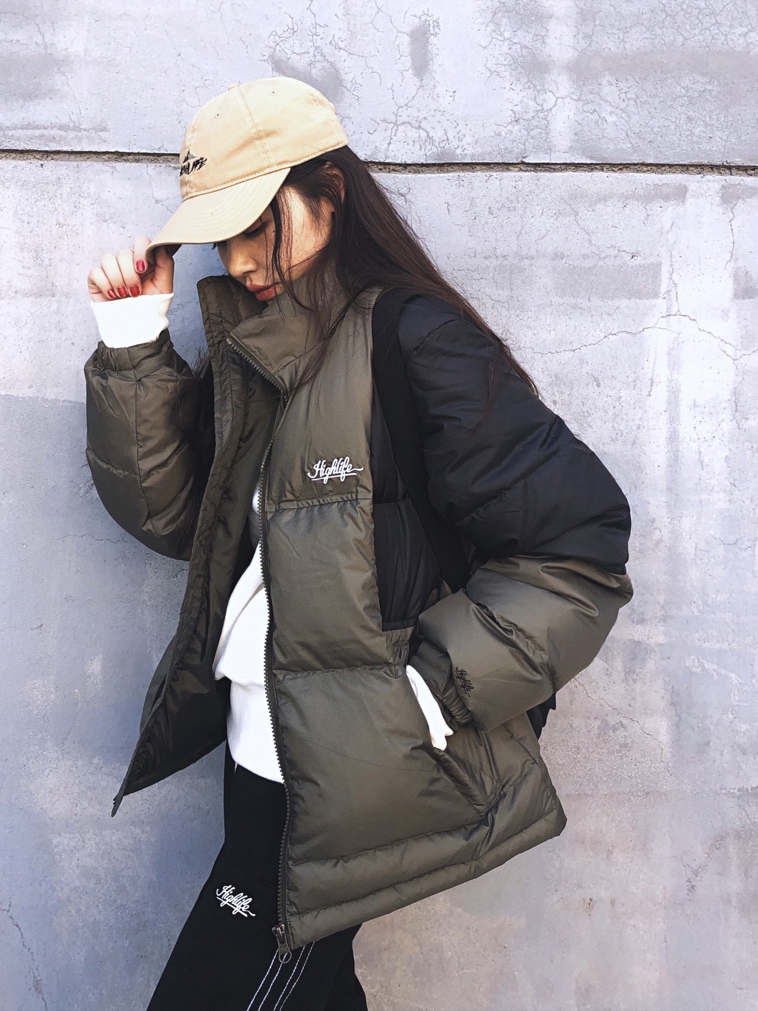 拼接棉衣,颜色拼接碰撞,不单调,也不会太突兀或太平庸,搭配小脚裤,头戴棒球帽,出街潇洒且独特。