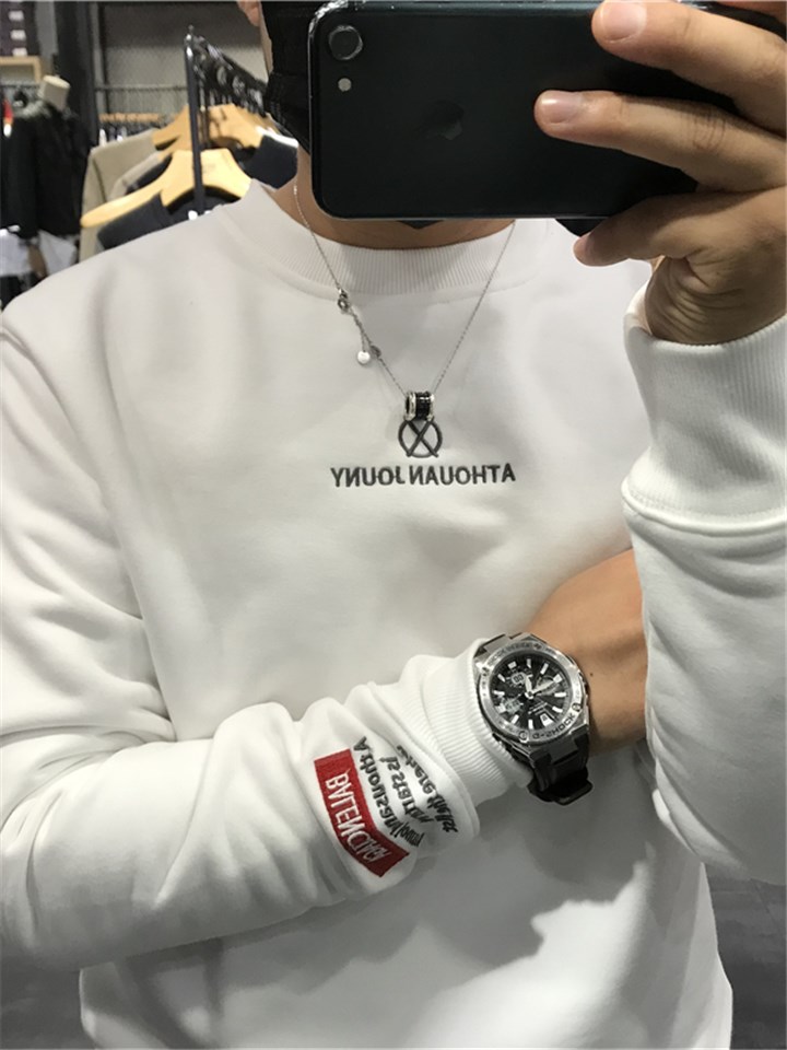 纯色设计,彰显青春活力,圆领设计,彰显绅士风度,经典圆领设计,简约大方,纯色打底衫,简约又百搭,休闲版型,让你轻松驾驭。