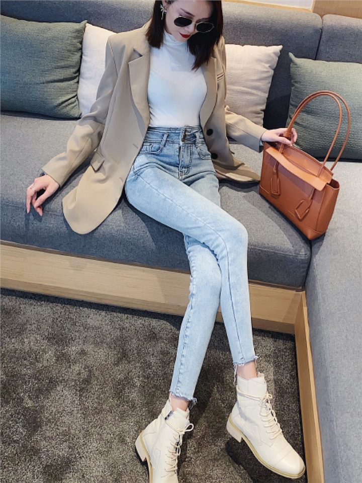 高腰的设计,拉长腿部线条,显瘦效果很好,高腰的版型,很显高挑,修身的剪裁,修饰腿部曲线,上身很有范。