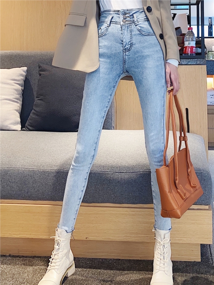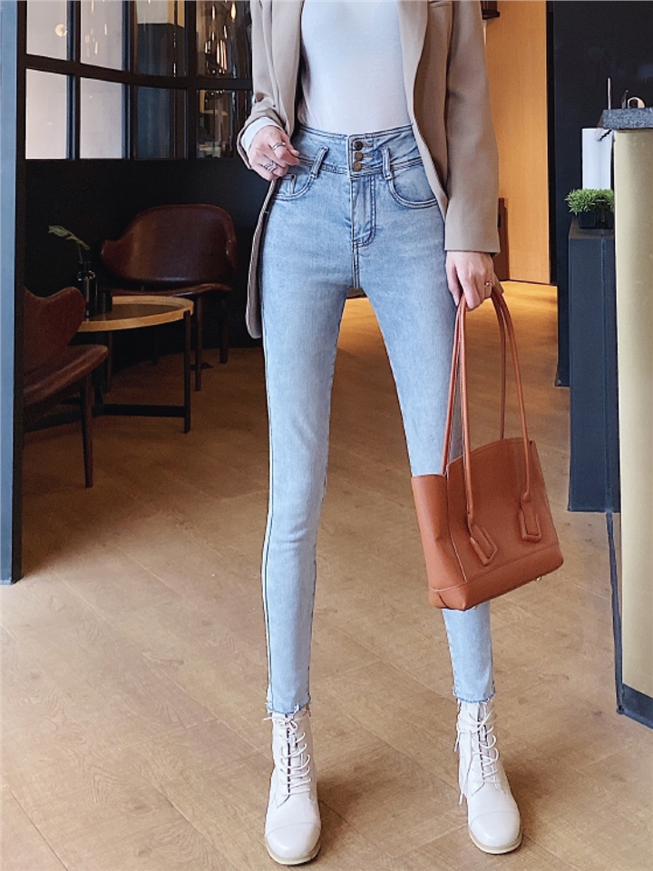 高腰设计,拉长身材比例。高腰牛仔裤,显瘦显腿长。直筒裤型,修饰腿部线条。