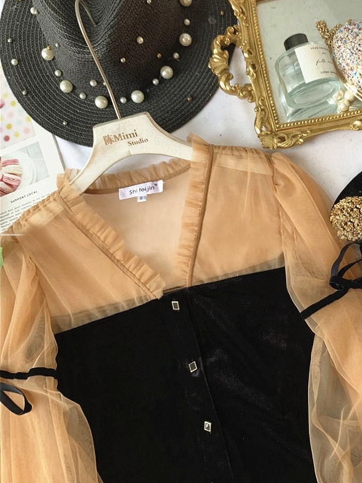 丝绒网纱拼接的设计独特别致,时髦有型,不仅使衣服更具层次感,同时还能打破沉闷的感觉。