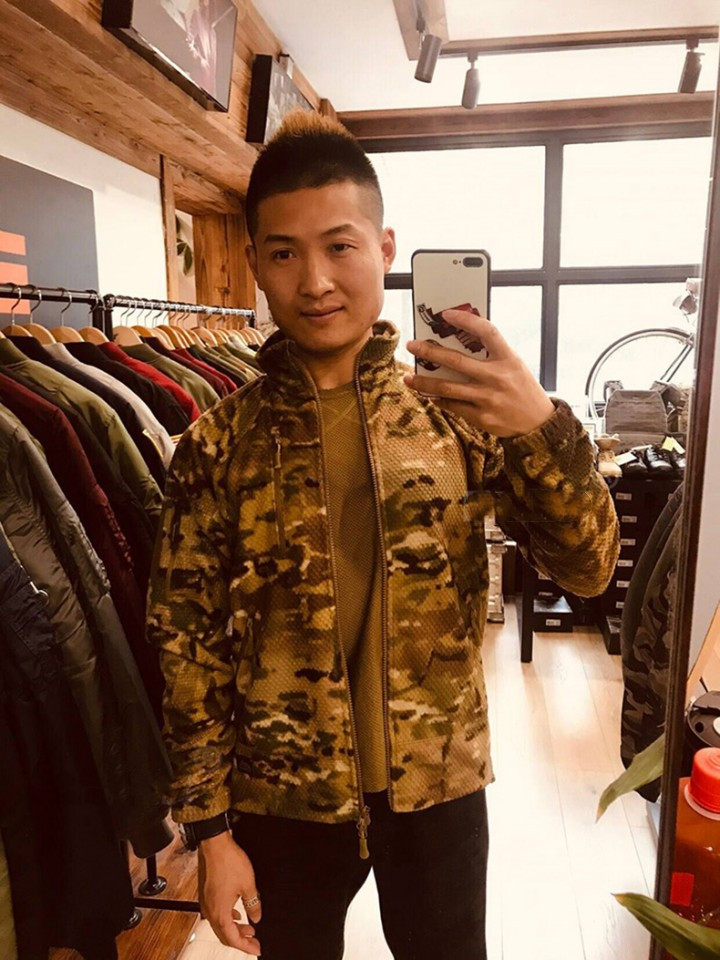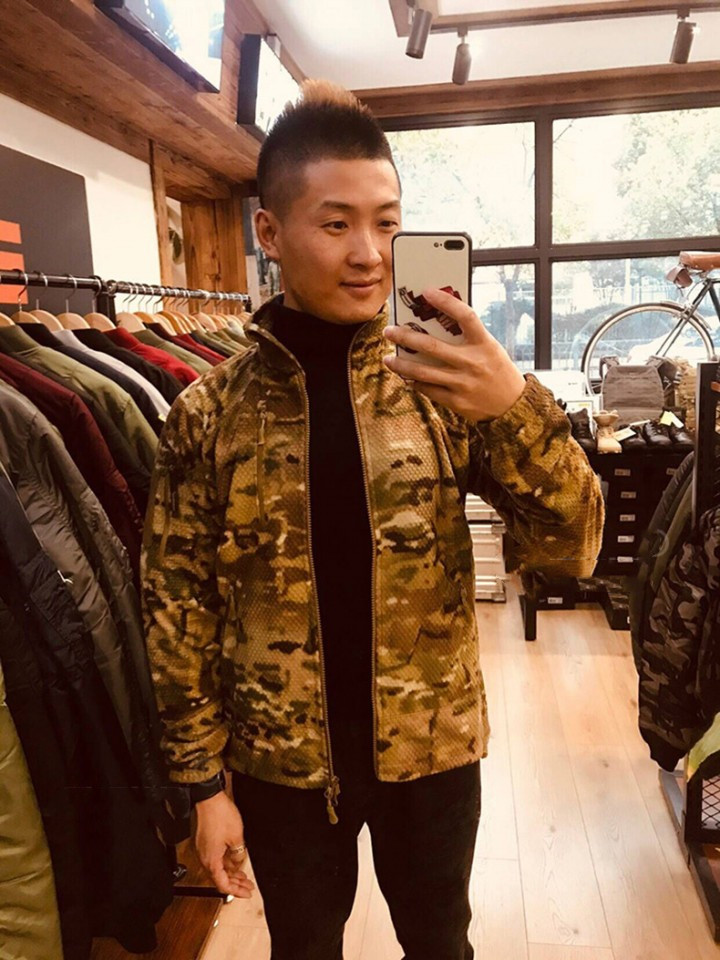 这一款男子的摇粒绒夹克有棕色与深灰色的色调,颜色沉稳大气,纯色十分简约大方。衣服生有方格子的暗纹,简约中带着不凡的气质。