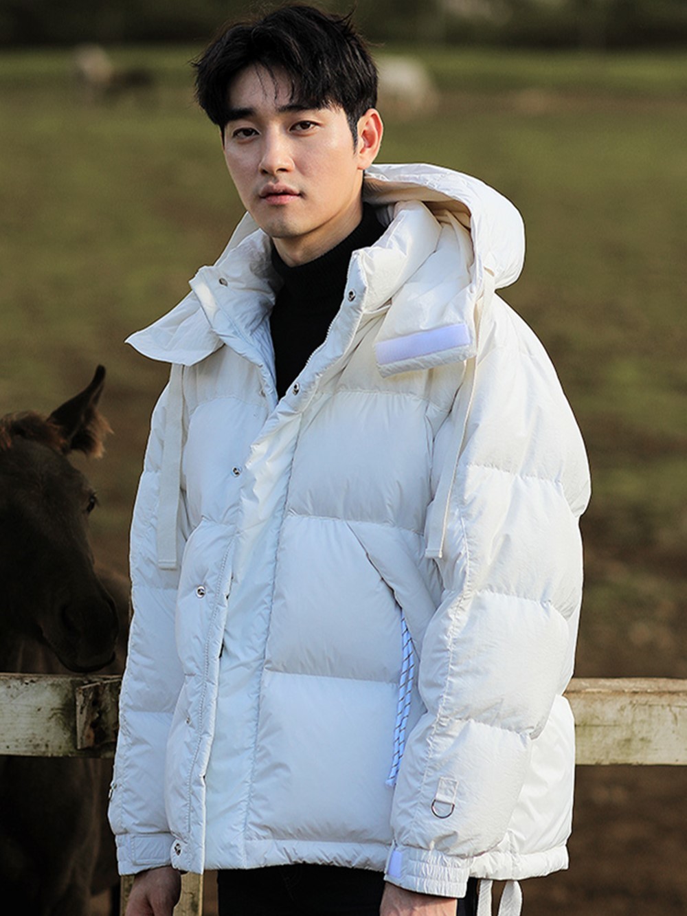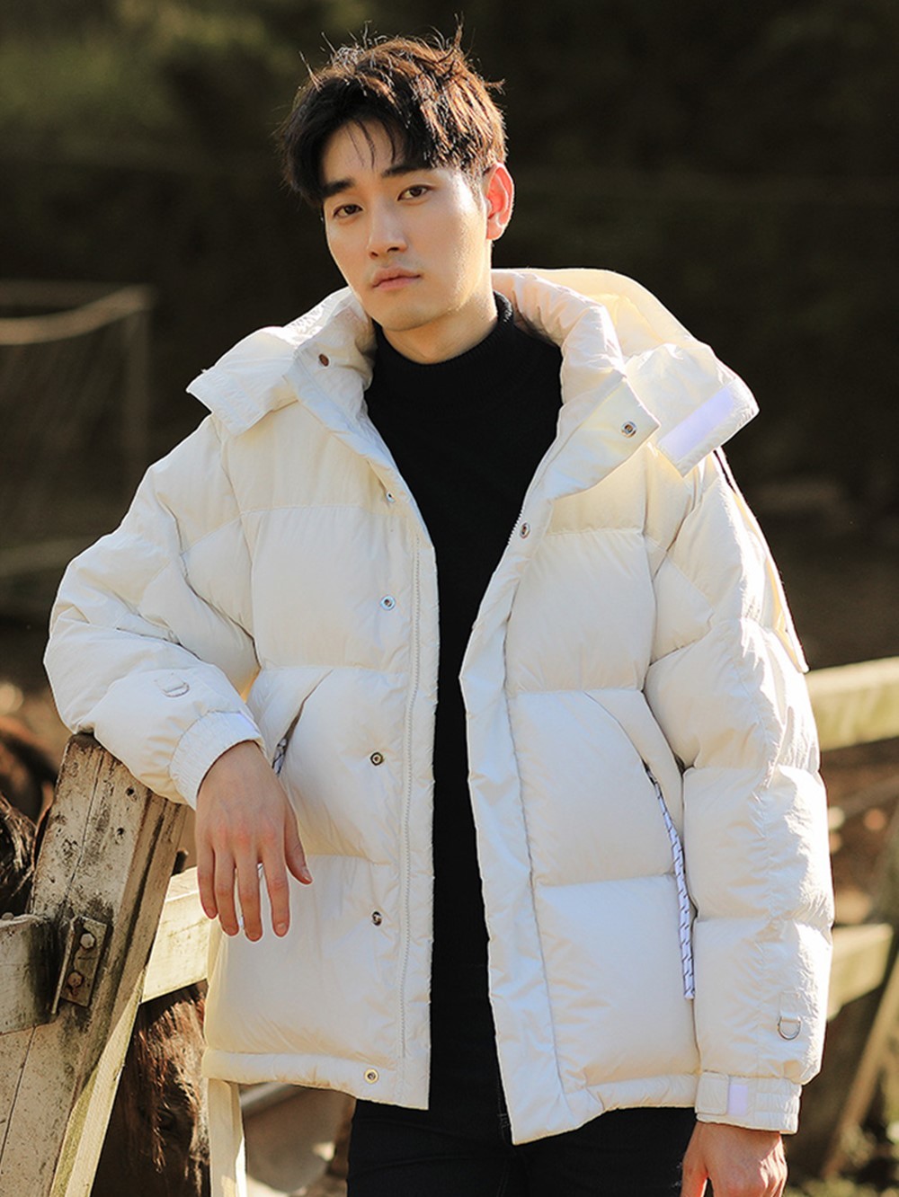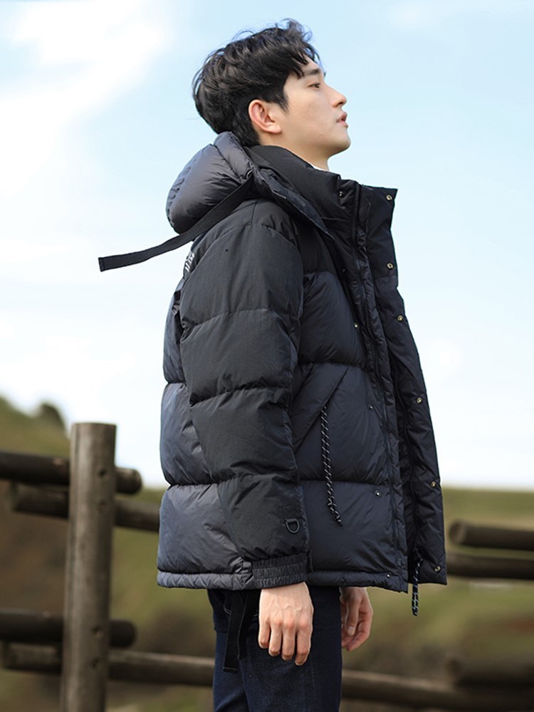 采用抽绳连帽设计,可自由收紧绳子,更加防风御寒;胸前以安逸猿元素魔术贴设计点缀,丰富衣身视觉感;采用白鸭绒填充设计,保暖更加轻盈,搭配各种款型的裤子都可以。