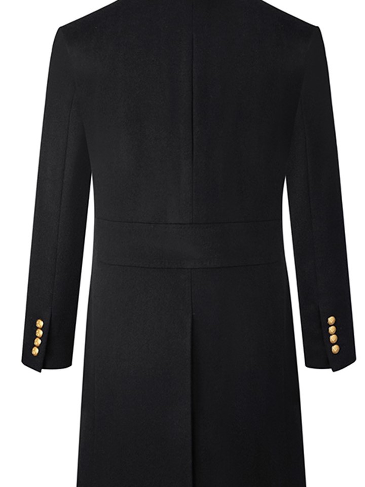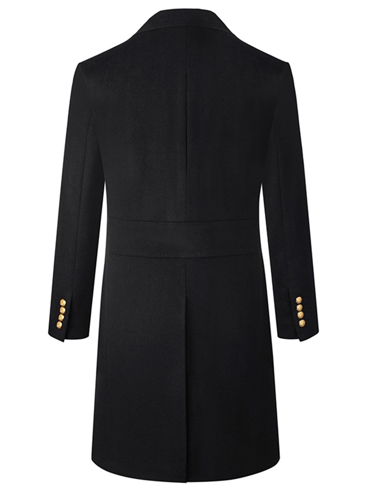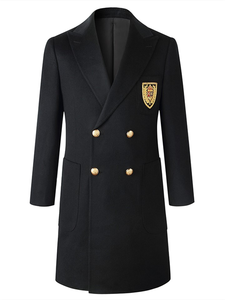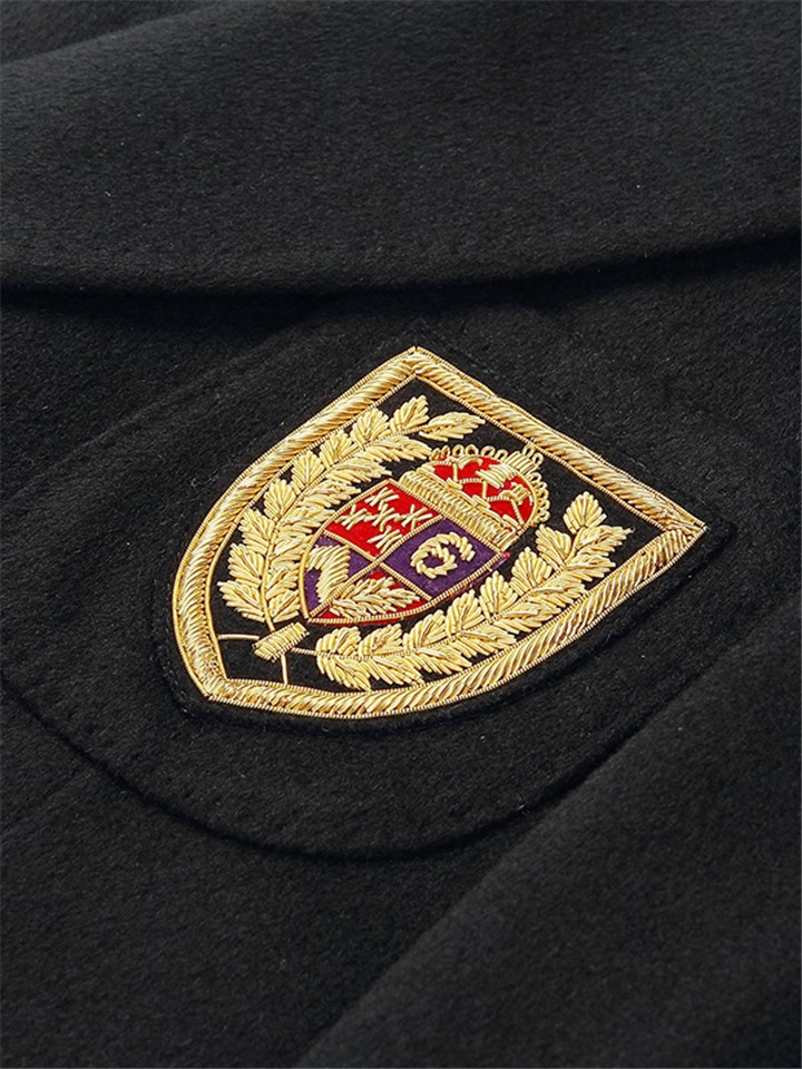 纯色款式,简约而不简单,徽章装饰,彰显品牌魅力,纯羊毛材质,舒适又保暖,大衣版型设计,修身显瘦,金色的设计,时尚感十足。