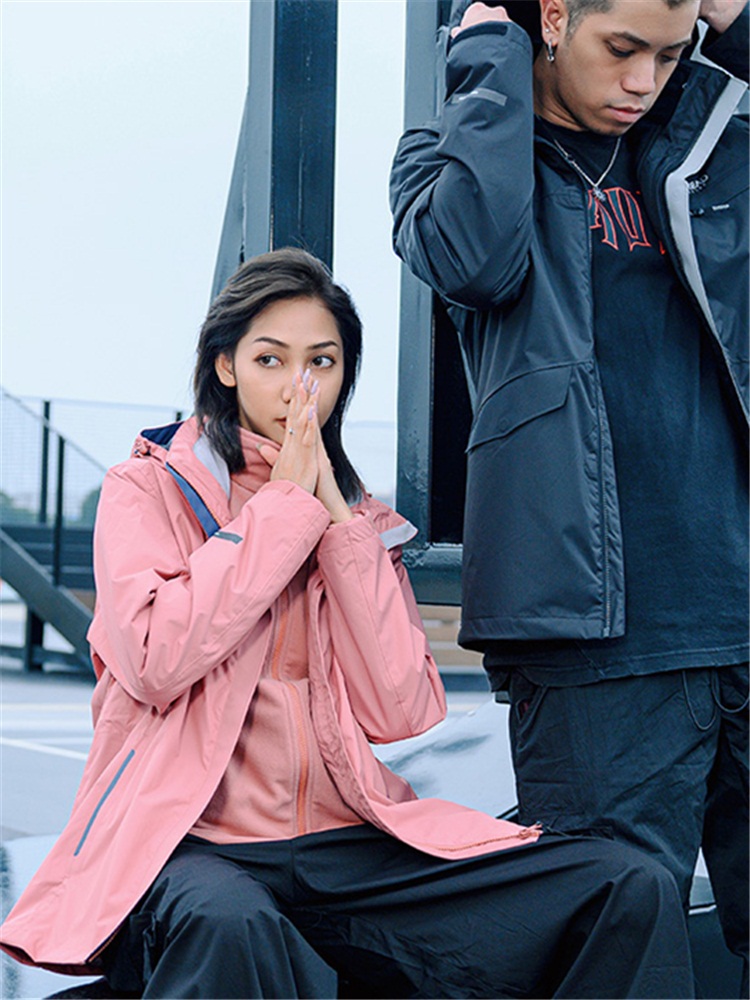 三合一两件套冲锋衣,内胆可拆卸,可外套单独穿,可内胆单独穿,也可两件合起来一起穿着。天气热的时候穿单件,天气冷的时候一起穿着,外套防风防雨,内胆保持体内温度,是一款居家旅行必备的户外冲锋衣。