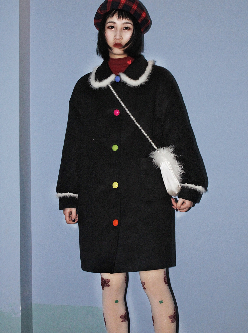 彩色扣子的毛毛娃娃领大衣,可爱减龄,尽显十足的复古宫廷少女风。
