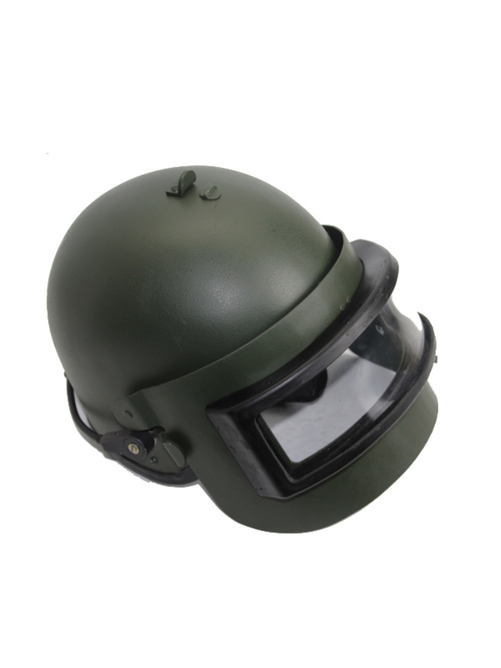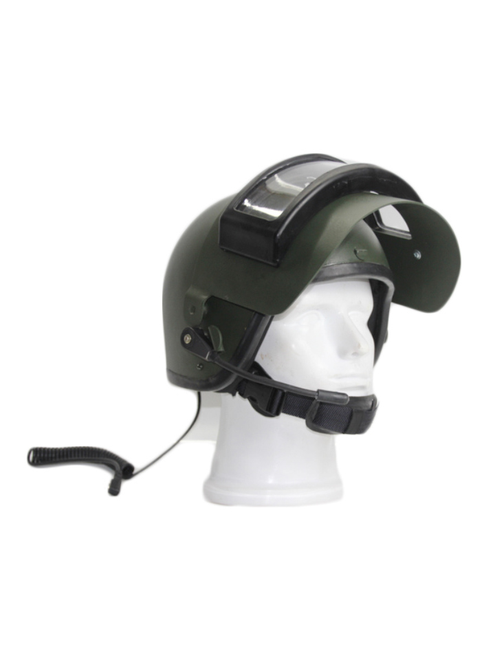 这款俄罗斯复刻的阿尔金头盔,加强玻璃纤维盔体,全钢面罩,视窗采用加厚有机玻璃片。带有内置通讯系统,标准对讲机插头。用料扎实,可以达到防暴盔的强度标准,并可以抵御低速破片。