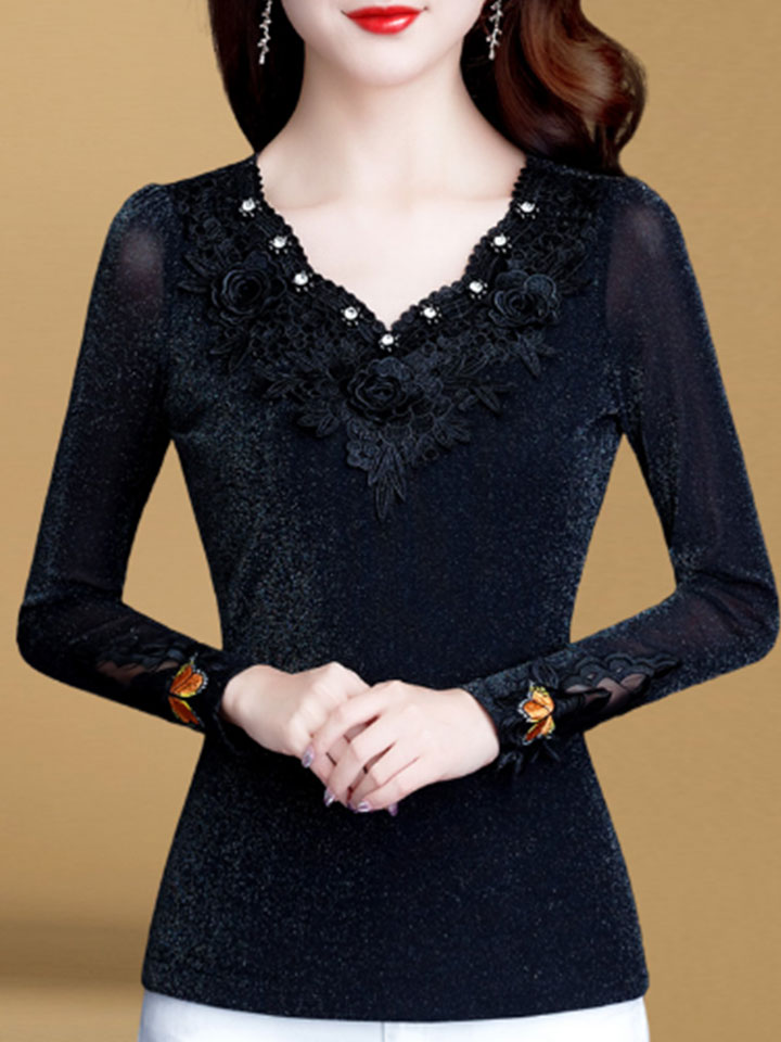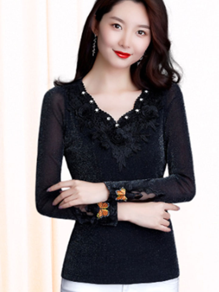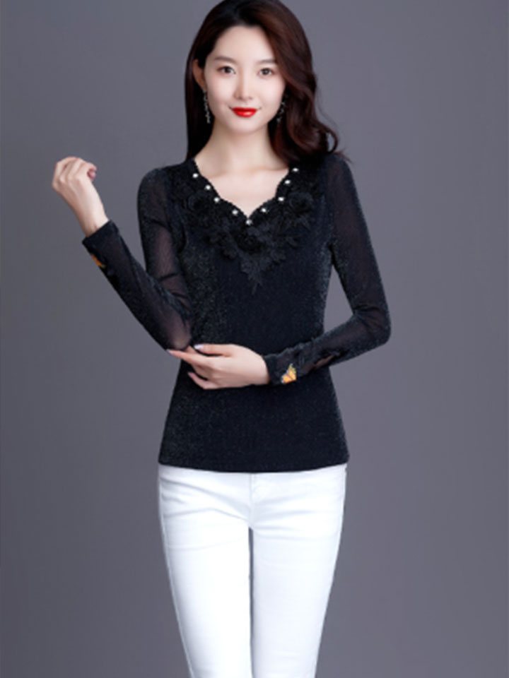 很修身的一款打底衫,蕾丝的面料,钉珠的装饰,甜美迷人,优雅性感的V领设计,气质更加的优雅,浪漫的蕾丝花边,更显的落落大方。