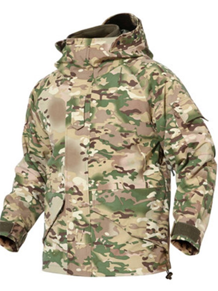 多种颜色,满足不同需求,迷彩印花设计,时尚潮流,连帽设计,防风保暖性强,压胶工艺,防水效果更好,防风防水面料,保暖性强,雪纺面料,防风保暖性强,100%聚酯纤维的材质。