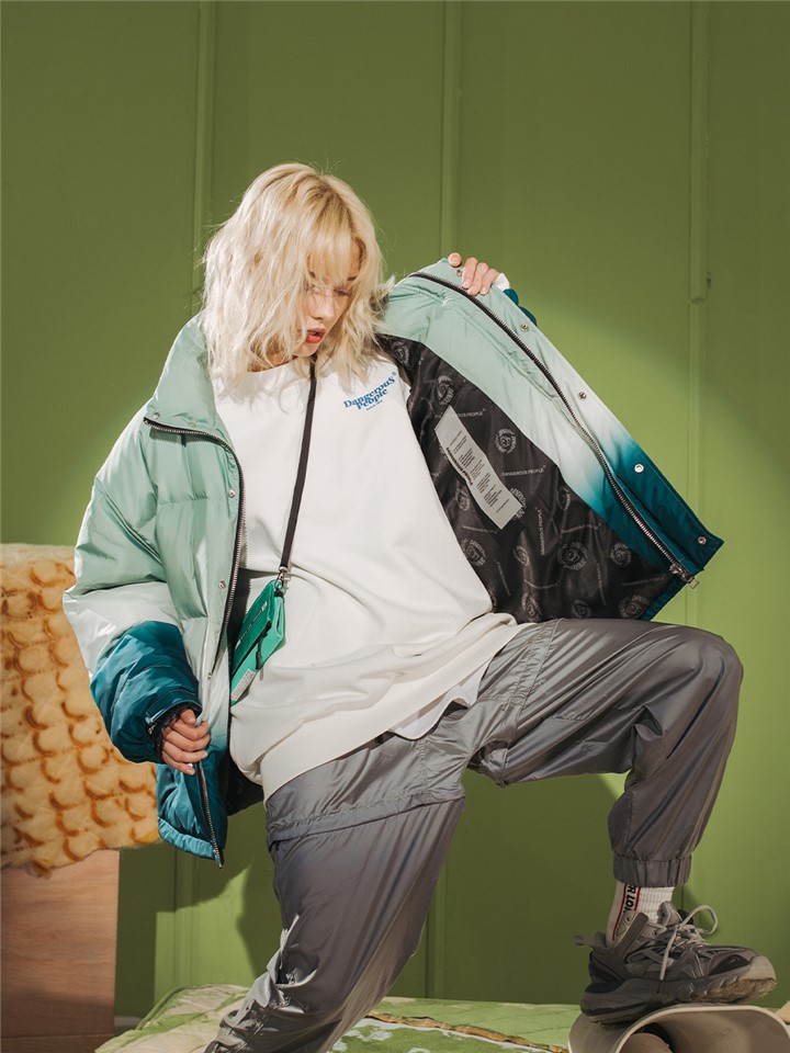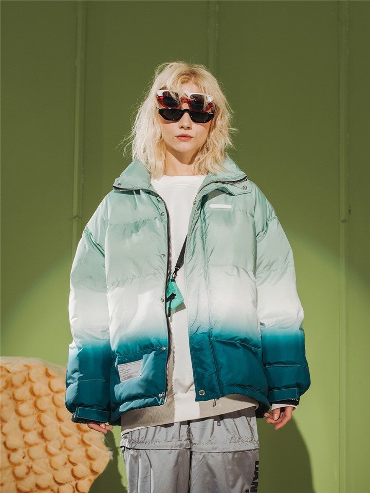 连帽设计,防风保暖舒适,连帽设计,防风保暖性强,渐变色彩,彰显时尚个性,棉服设计,穿着舒适保暖。