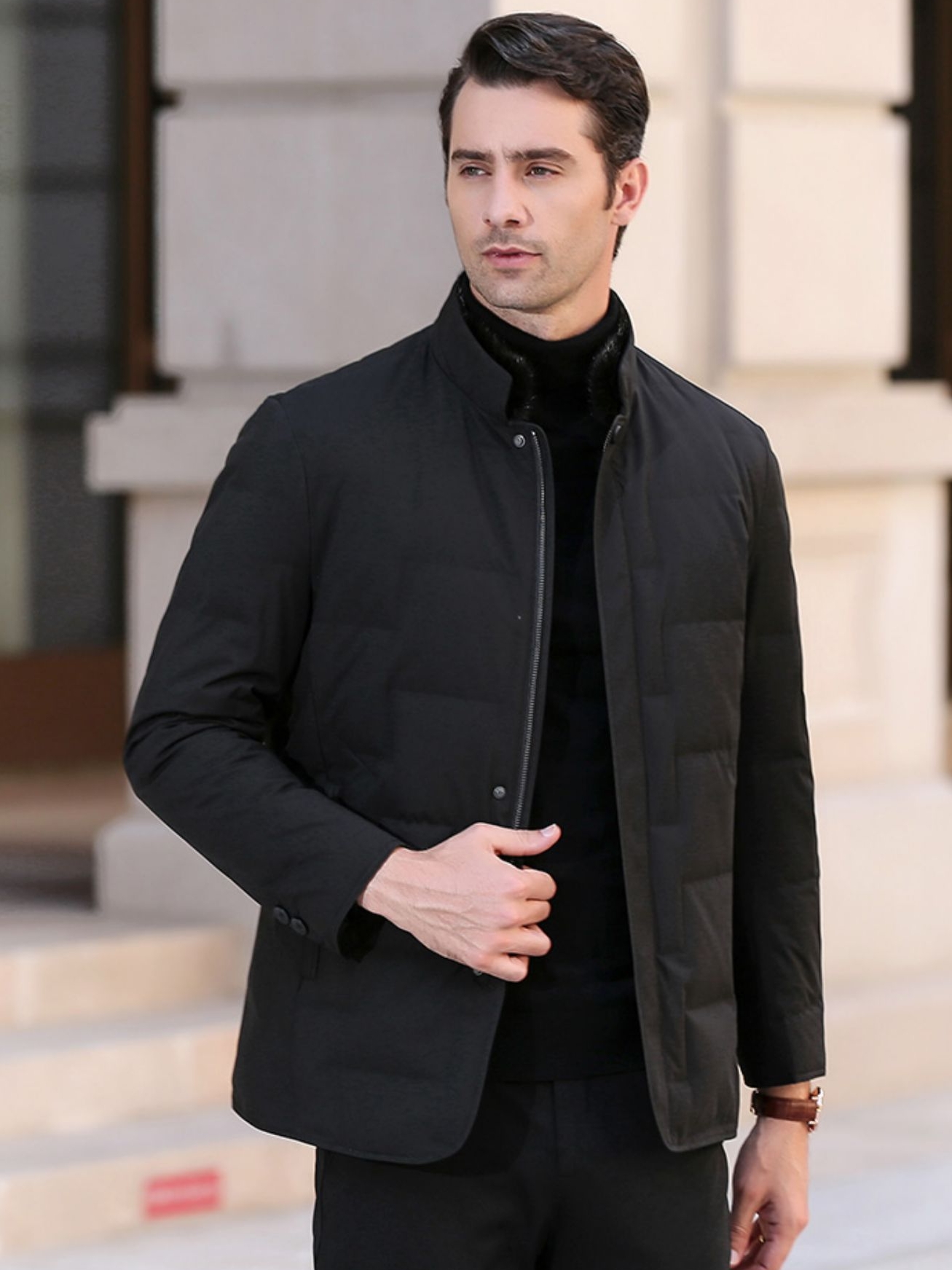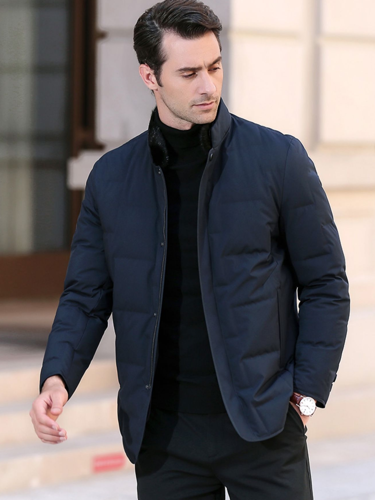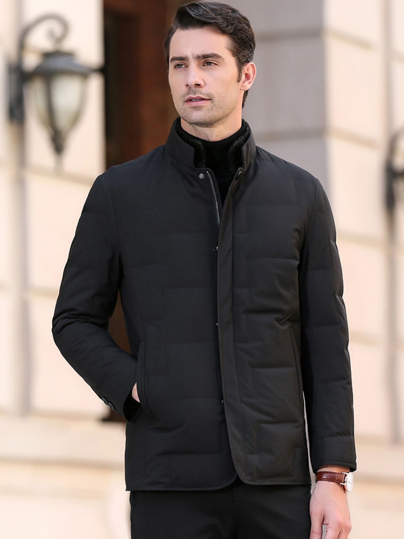 一件非常经典的羽绒外套,时尚大气的版型设计,简约又百搭,型男冬天都喜欢穿这种简约又帅气的款式。优雅的黑色本来就很酷。