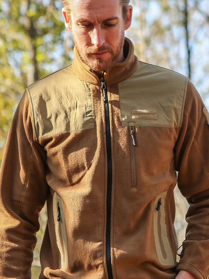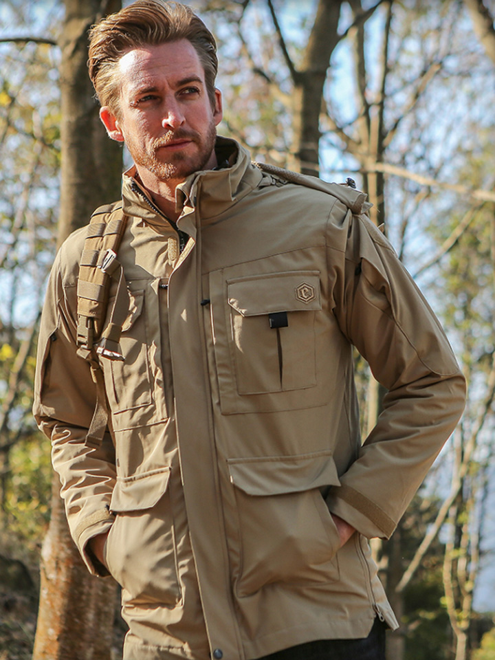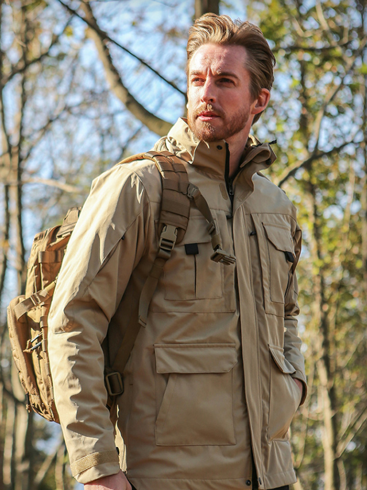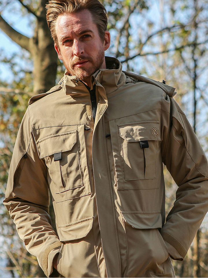 这款冲锋衣采用工装风多口袋设计,具有良好的透气性能;内里采用抓绒面料设计,有效防风保暖。