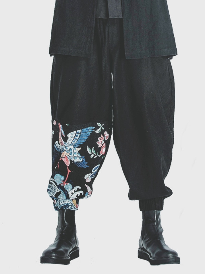 颇为帅气的一款长裤,纯纯的底色,尽显简洁 干练;设计亮点是裤脚处的中国风花色装饰,看上去极其亮眼,与纯色形成鲜明对比,宽松版型设计,舒适自如。