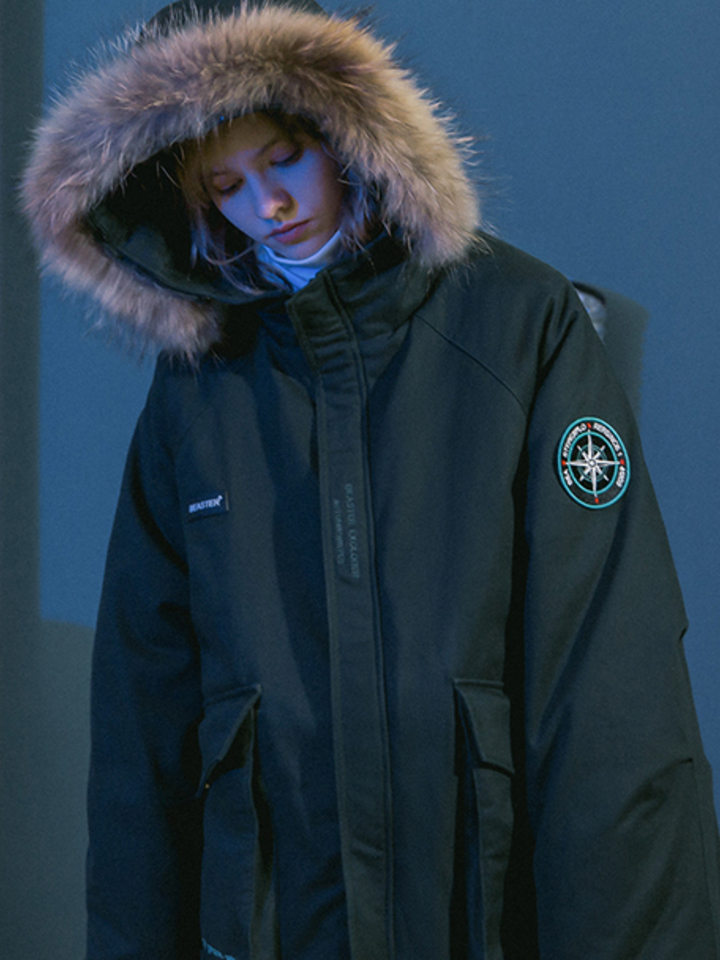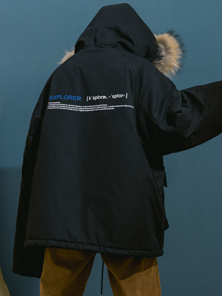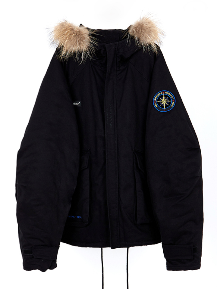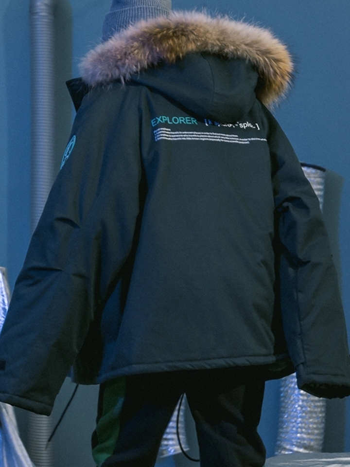 嘻哈风羽绒服,优雅大气的黑色,给寒冷的冬季增添几分暖意,大大的连帽毛领,带着雍容华贵之感,尽显时尚大气,宽松的短款款式,穿上修饰身材,拉伸身材的曲线,不显肥胖臃肿。
