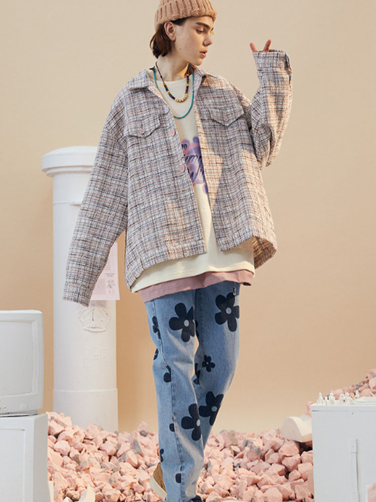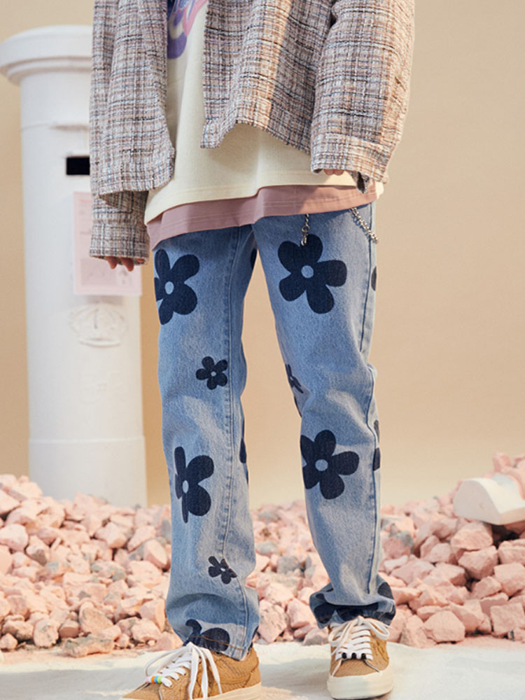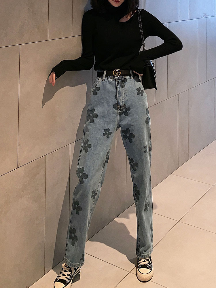 这款洋溢着青春气息的浅蓝色印花牛仔裤,散发着活泼俏皮的少女气息,尽显一份既文艺又复古的时髦格调。