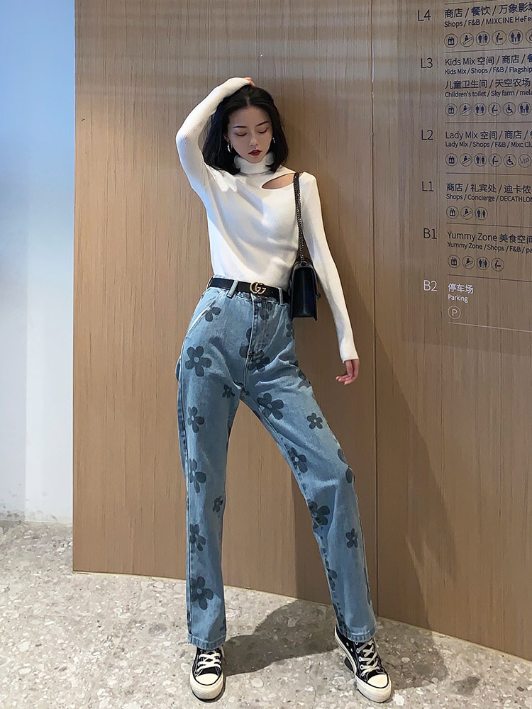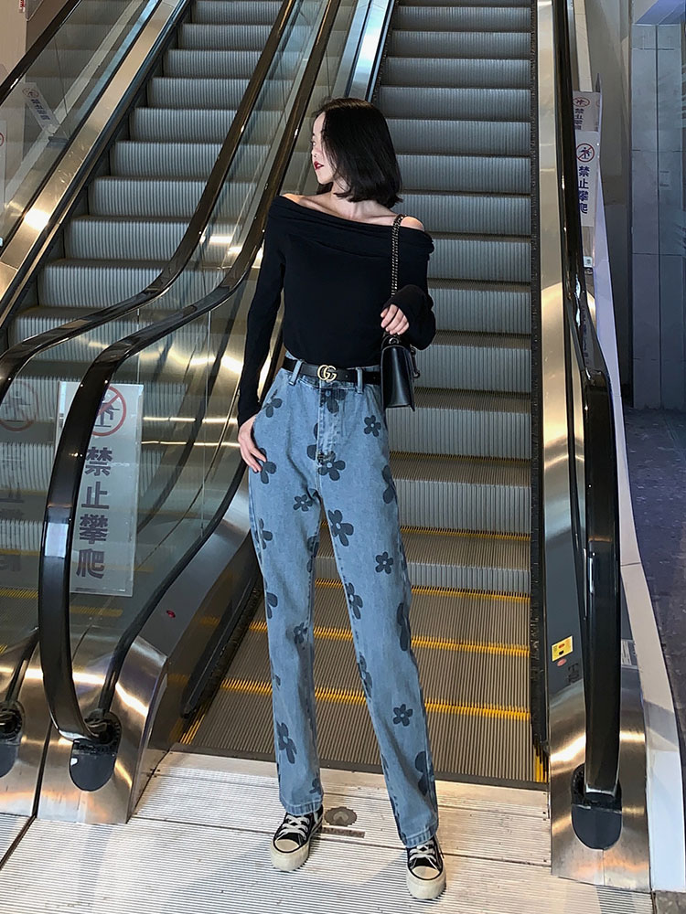 这件浅蓝色印花牛仔裤减龄潮流,搭配上一件白色露肩上衣,踩上一双单鞋,潮流吸睛,时尚出行。