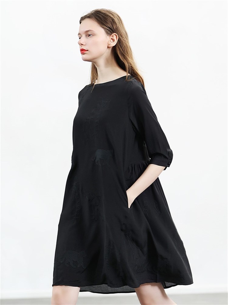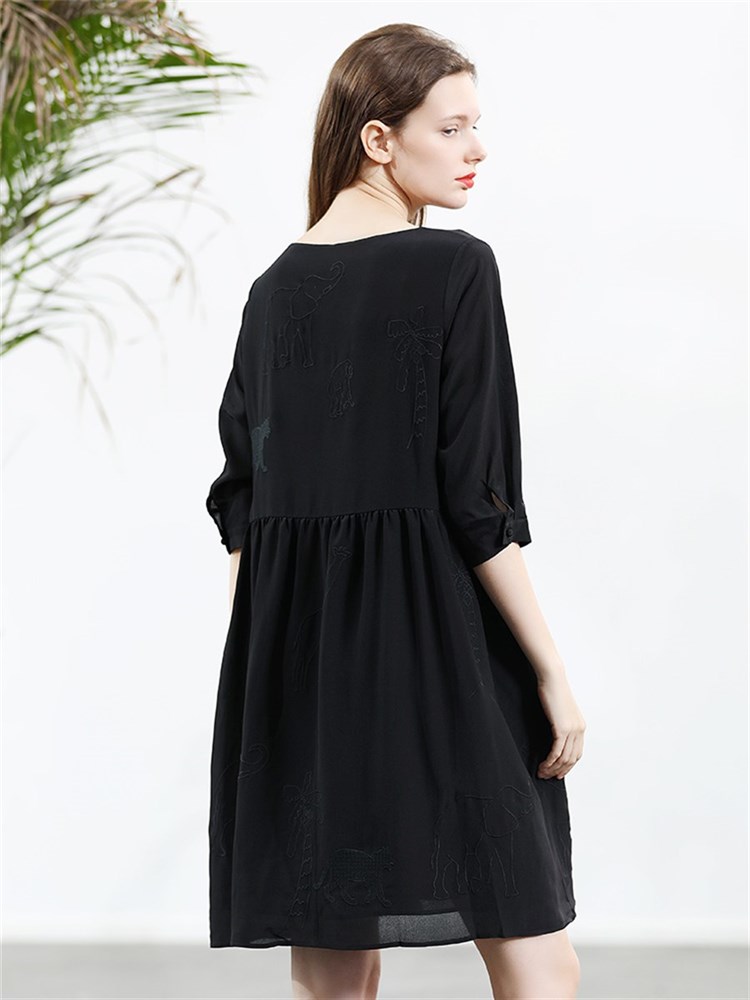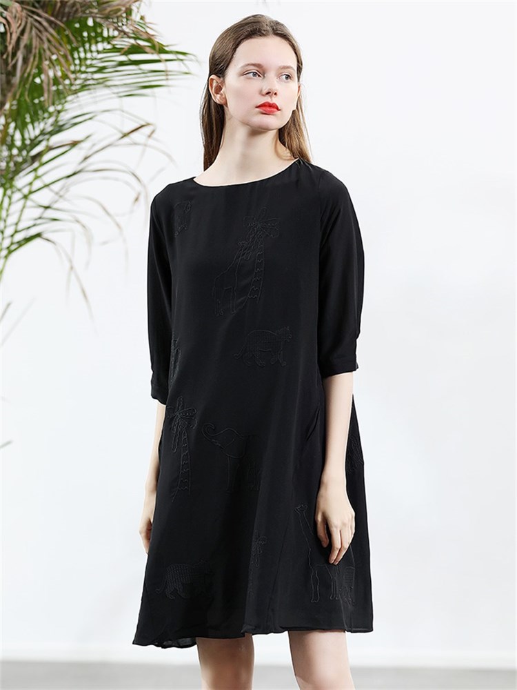 纯色的色调,简约又百搭,黑色的色调,经典又百搭,精致刺绣,彰显优雅气质,真丝面料,穿着舒适透气,高腰裙型,拉长身材比例。