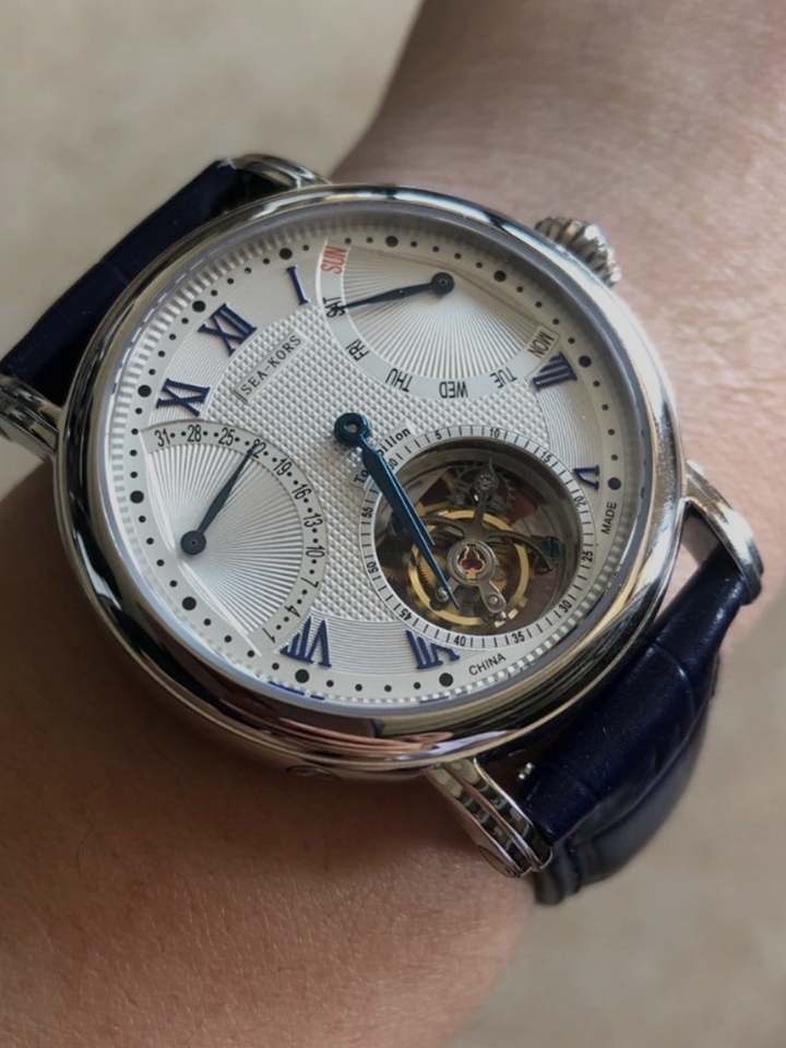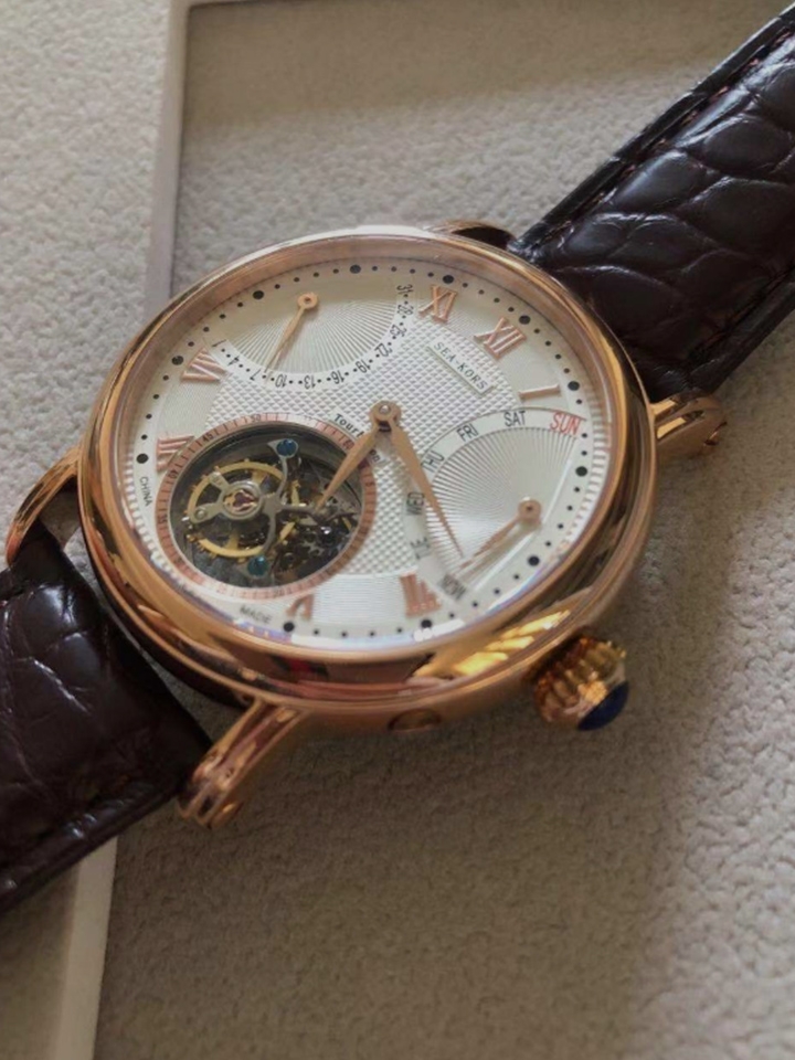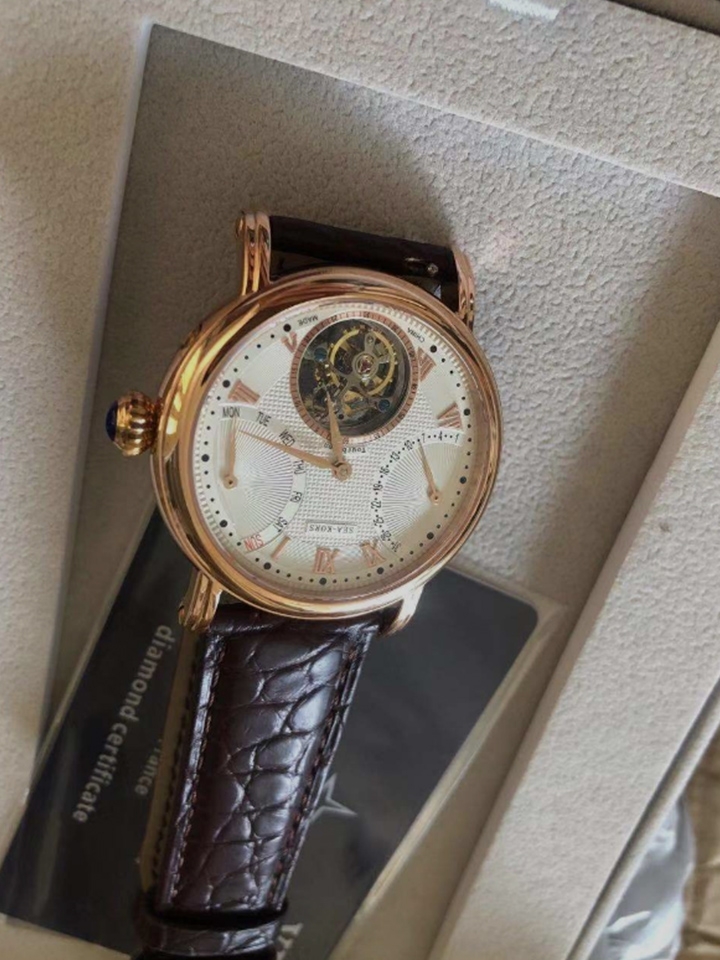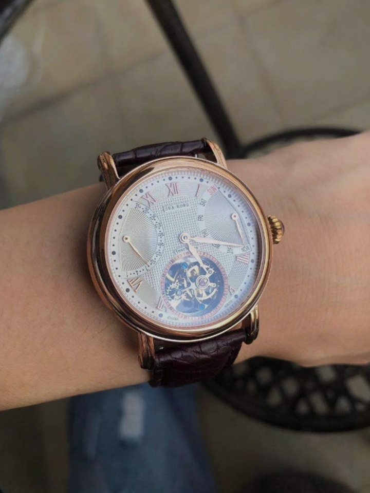 该款手表采用独特的飞轮机芯,走时精准时间持久。