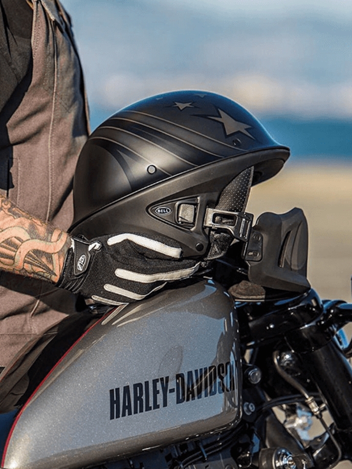 摩托车头盔复古哈雷版,营造出时尚高端品味。头盔采用进口玻璃钢纤维材料,坚固耐用,耐磨损,份量轻盈。产品高档内衬,内衬的透气小孔,更易排汗吸湿,让您戴起来更加舒适轻盈。
