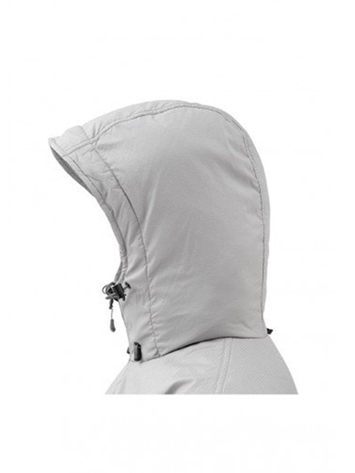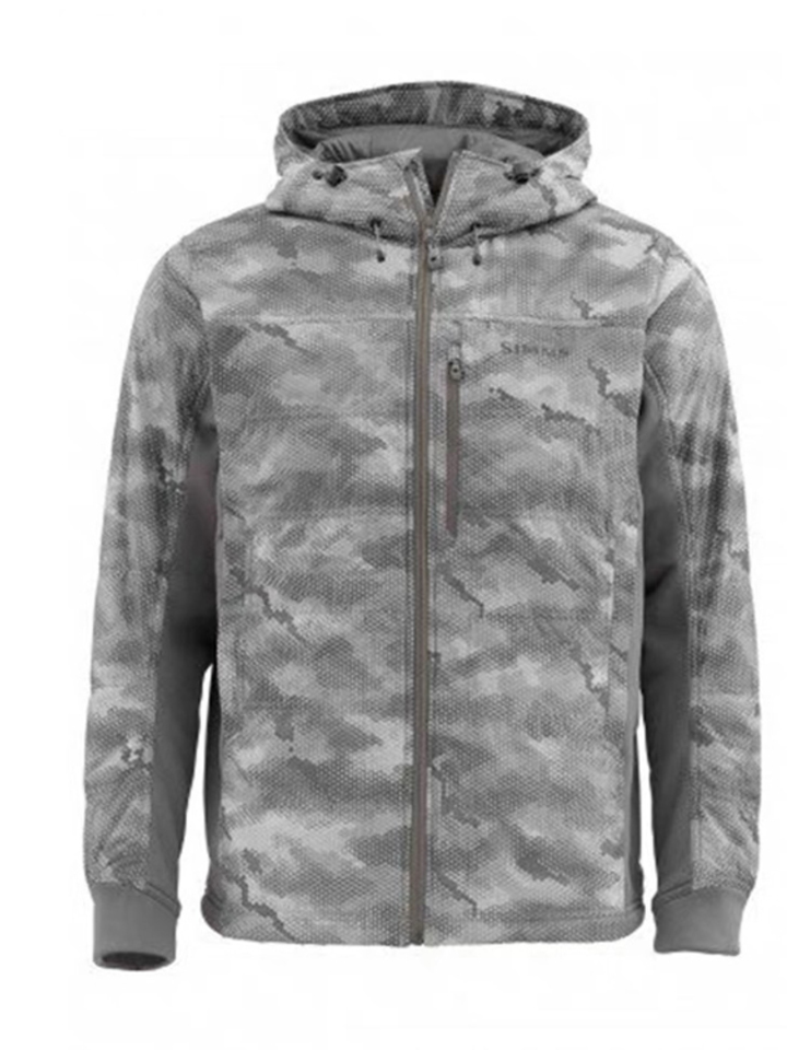 专为钓鱼而打造的连帽冲锋衣表面的迷彩花纹,制作出鱼鳞的外表状态,多个拉链口袋的设计便于容纳随身携带的物品,同时也具有实用性和功能性。