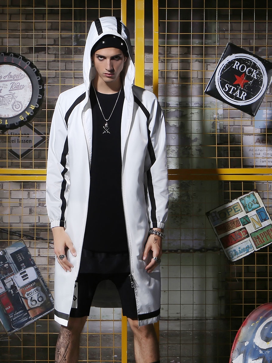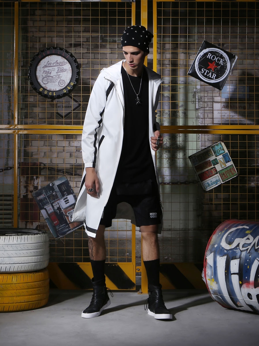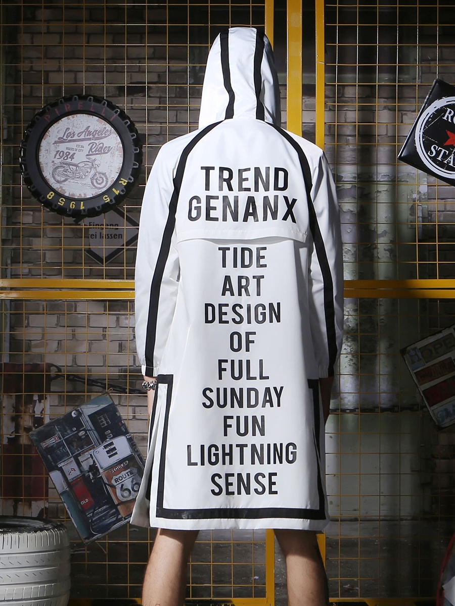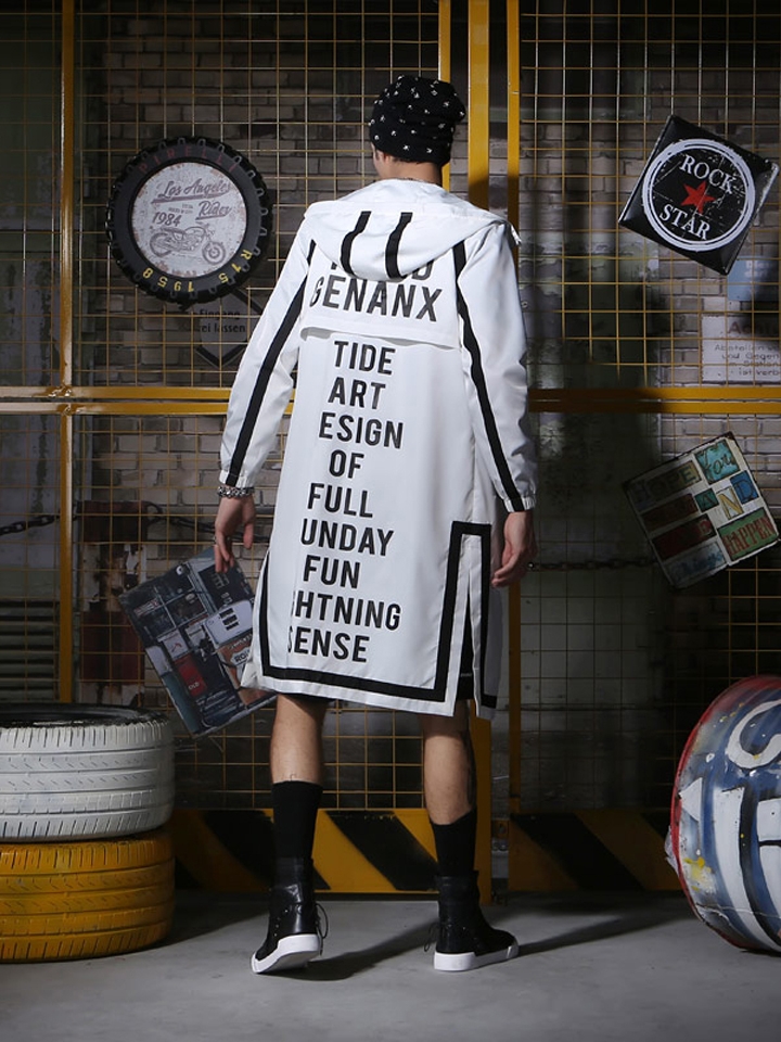 撞色的轮廓,显得立体有型,结构感满屏。前面简约,后面印花,繁简有序。青春活力连帽、双侧开叉下摆、潇洒中长款等细节设计,彰显街头随性感。