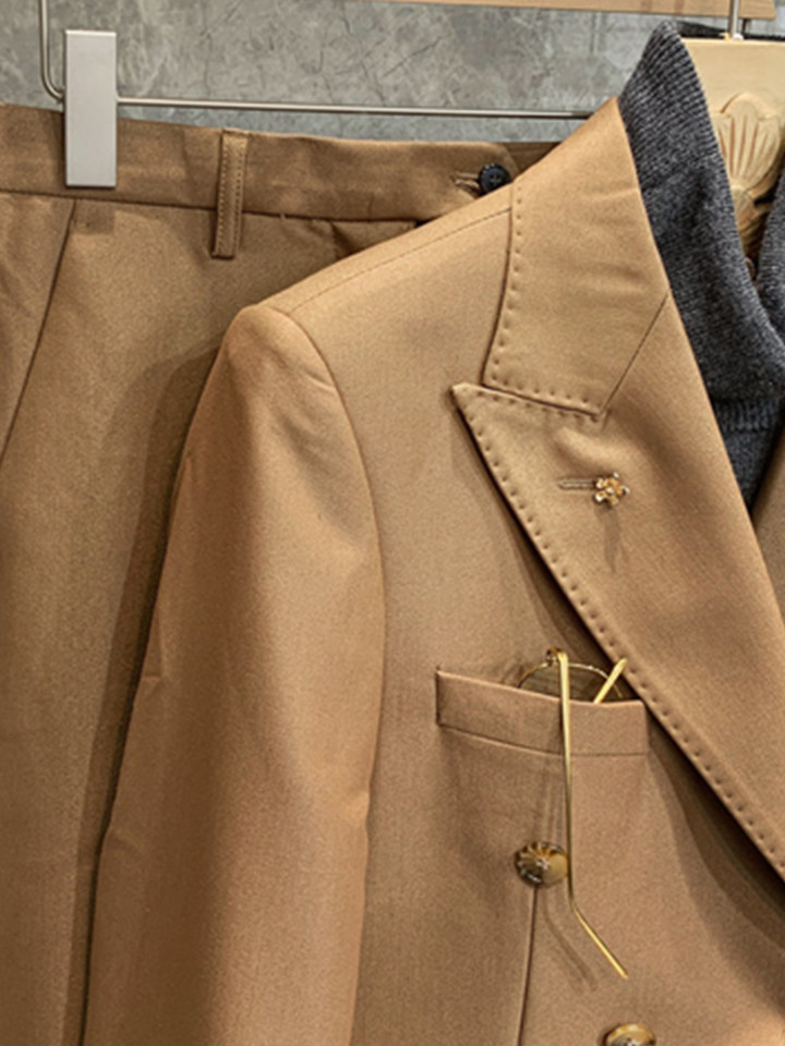 这件西装两件套本身就是很好的搭配,优雅时尚,又很帅气,衬托身材显高显瘦,很有气质,穿双皮鞋,增加时尚感。