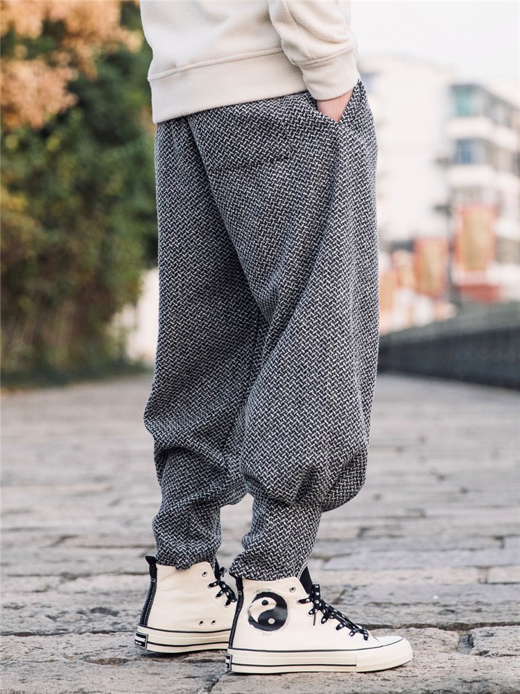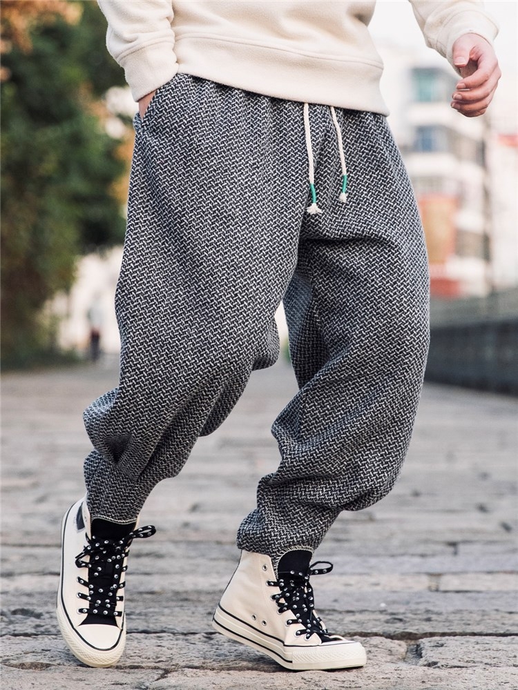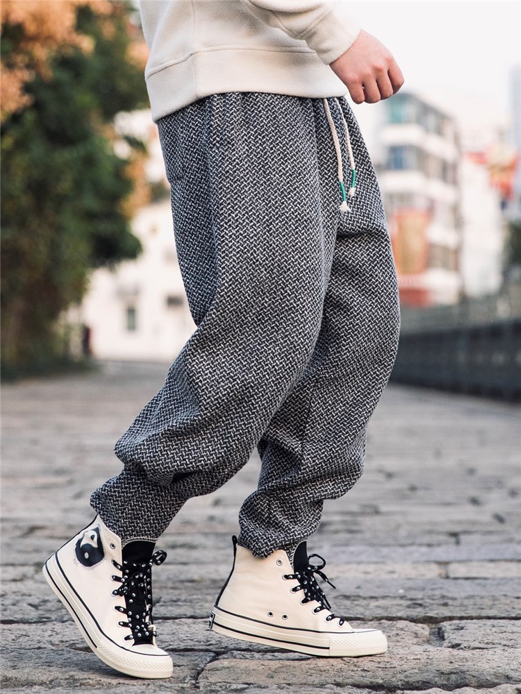 经典格子元素,复古时尚,收腰设计,修饰身材曲线,格子设计,彰显男士魅力,毛呢面料,穿着舒适保暖,宽松裤子,穿着舒适自在,宽松版型,穿着舒适自在。