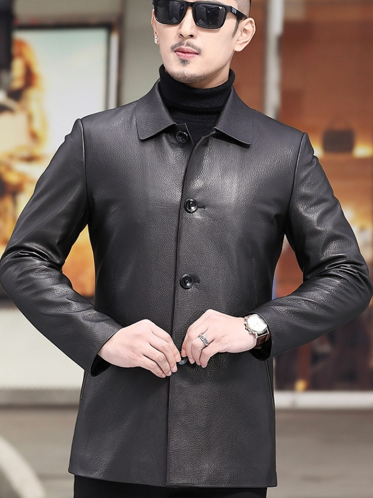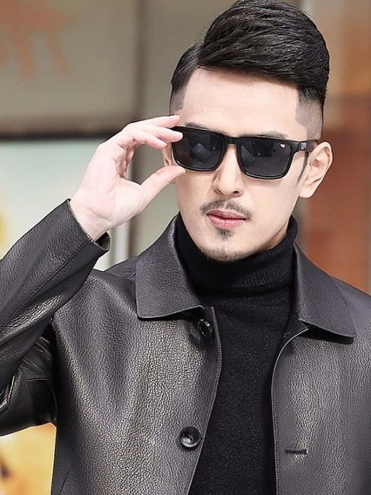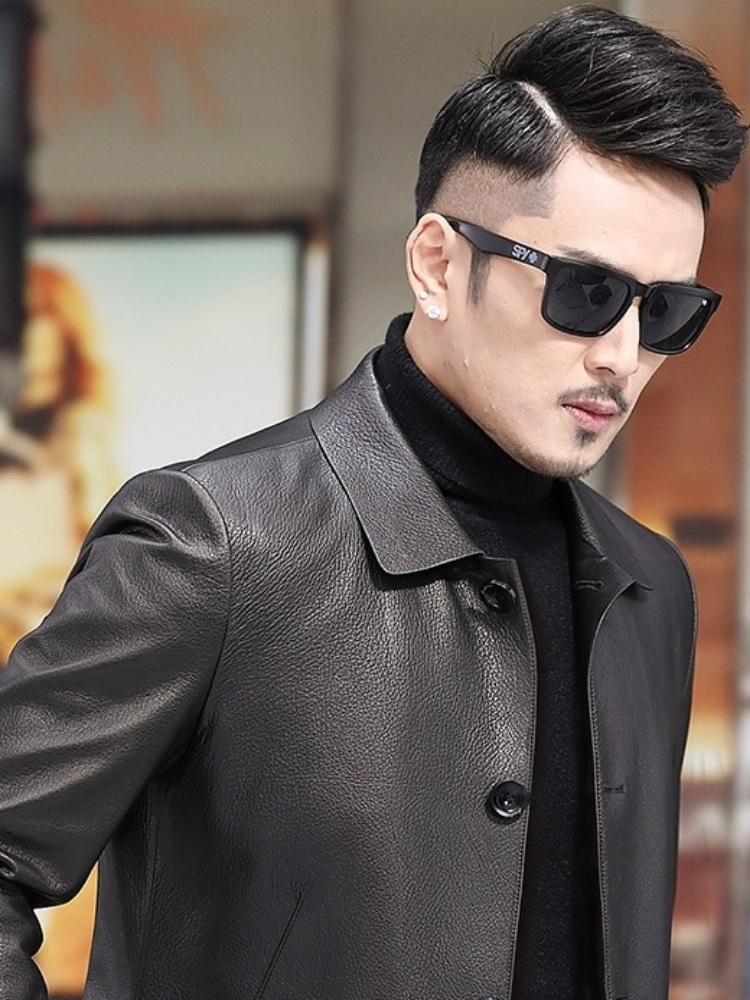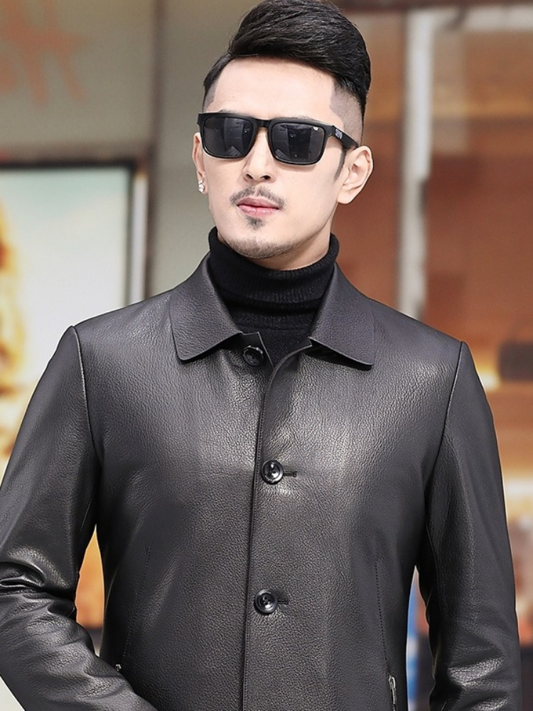 精选优质的绵羊皮面料,手感柔软细腻,穿着舒适保暖,经典的翻领设计,凸显男士的干练气质,修身的版型设计。