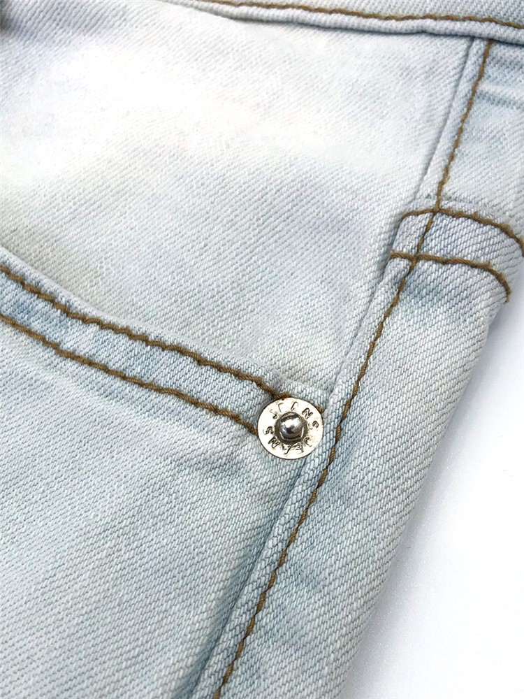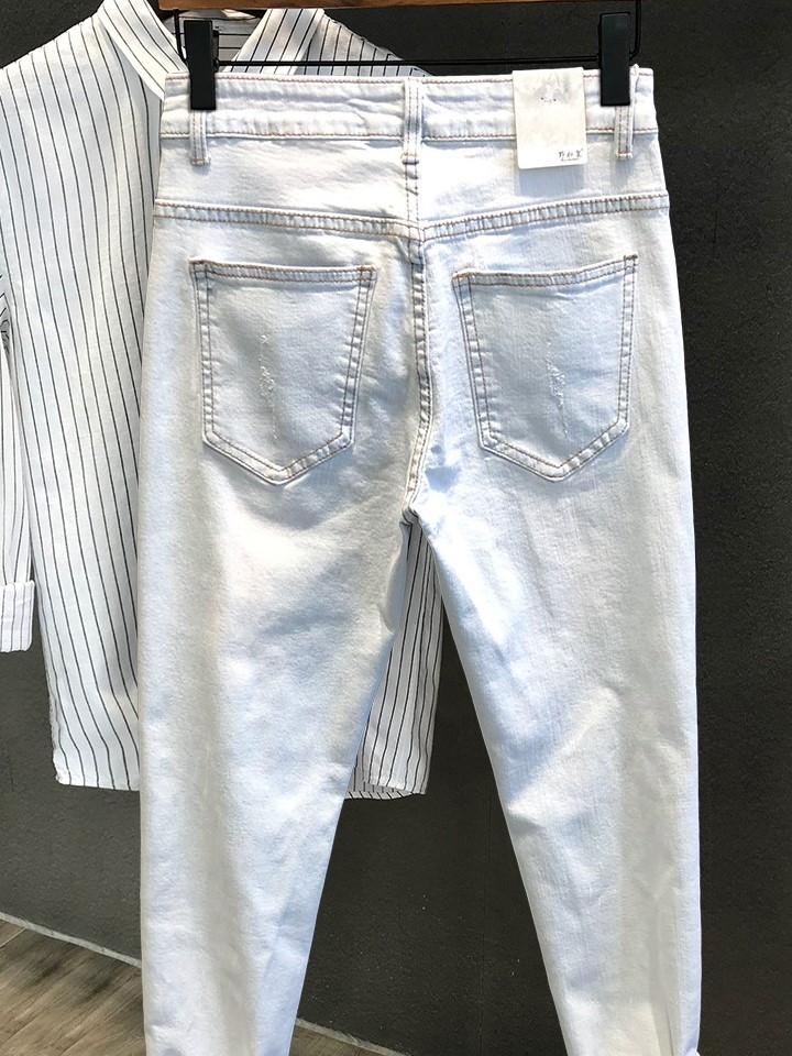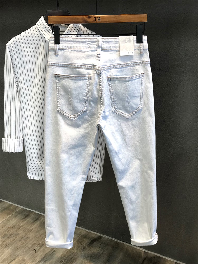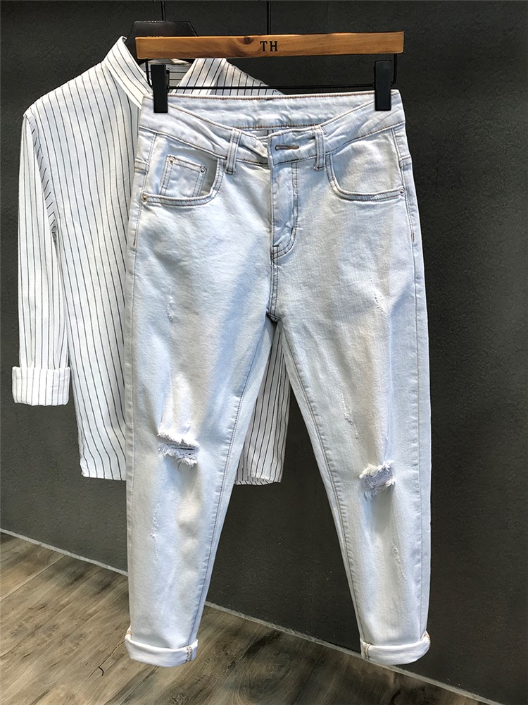 这款牛仔裤采用优质面料,柔软舒适,亲肤透气,修身小脚版型,修饰腿型,尽显时尚潮流范,破洞设计,个性时尚,彰显个性,小脚设计更显瘦,搭配一双小白鞋,帅气十足。