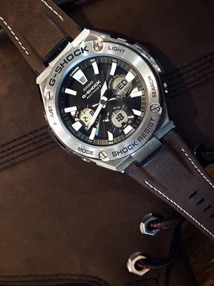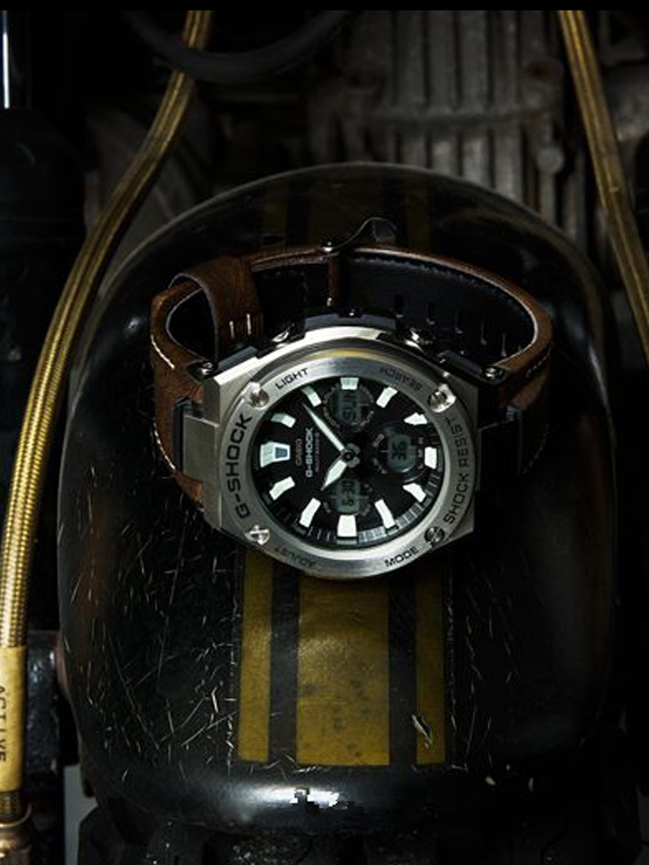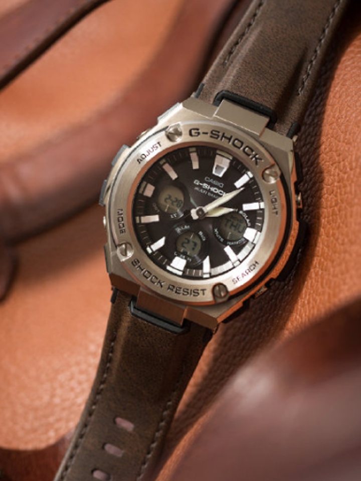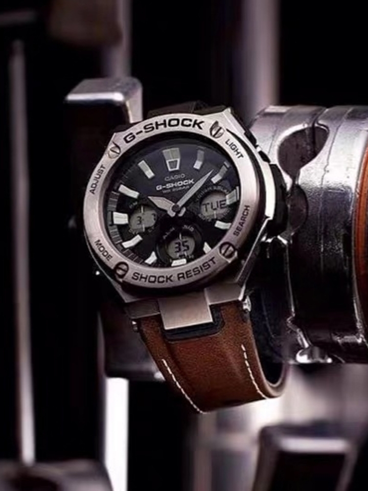 卡西欧的G-shock系列推出的G-STEEL新款,延续了经典黑色等经典配色,搭配皮革的冷静沉稳,很好的平衡了金属的出挑。超大指针的立体表盘,读取时间更加方便。轻盈的双针孔橡胶表带,更加贴合手腕,佩戴轻松舒适。