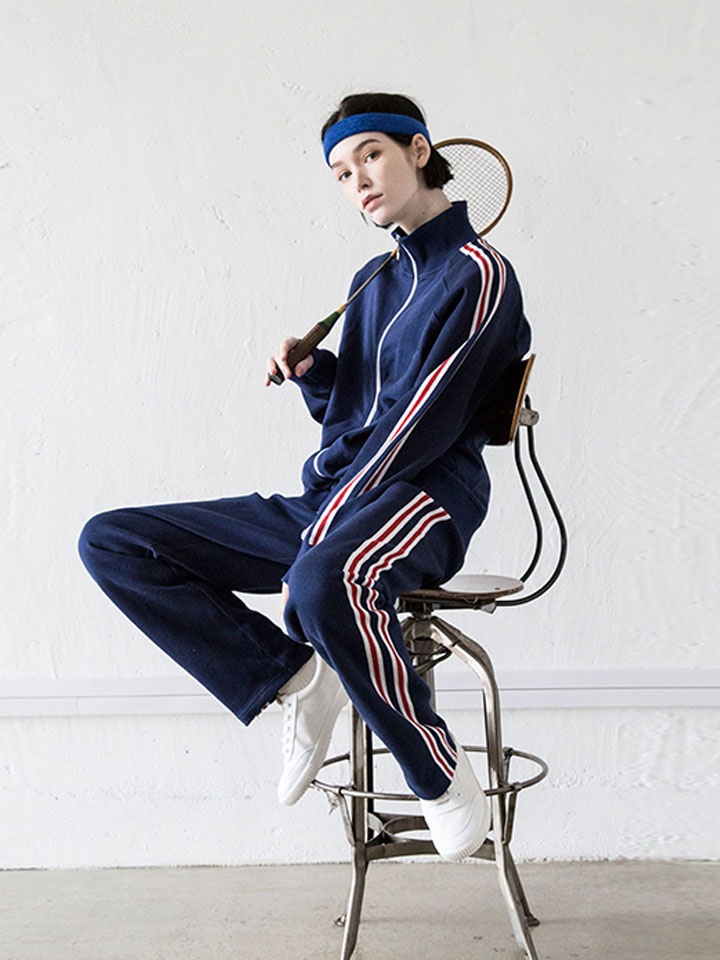 立领版型剪裁,有效修饰脖颈线条;裤身赋予系带抽绳设计,松弛有度,可便捷调节宽度。