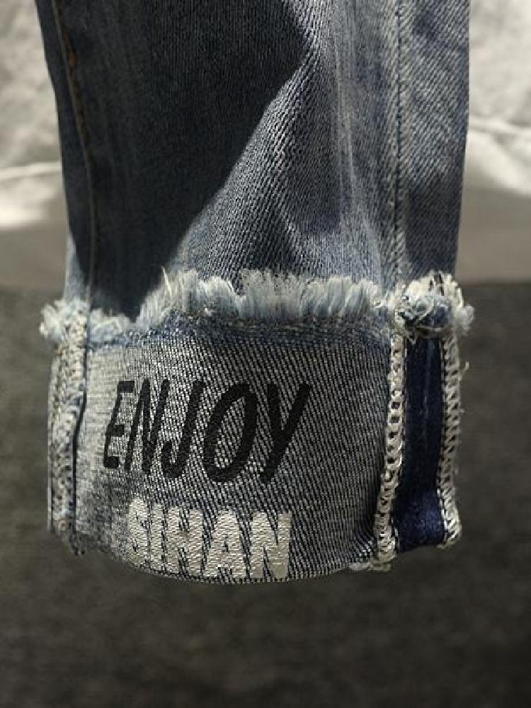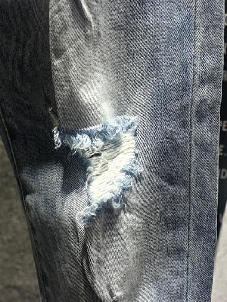 优质的水洗牛仔面料剪裁设计九分牛仔裤,时尚大口袋休闲裤,穿着舒适,品质上乘,款项时尚,裤身利用破洞装饰在衣身,彰显独特气质。