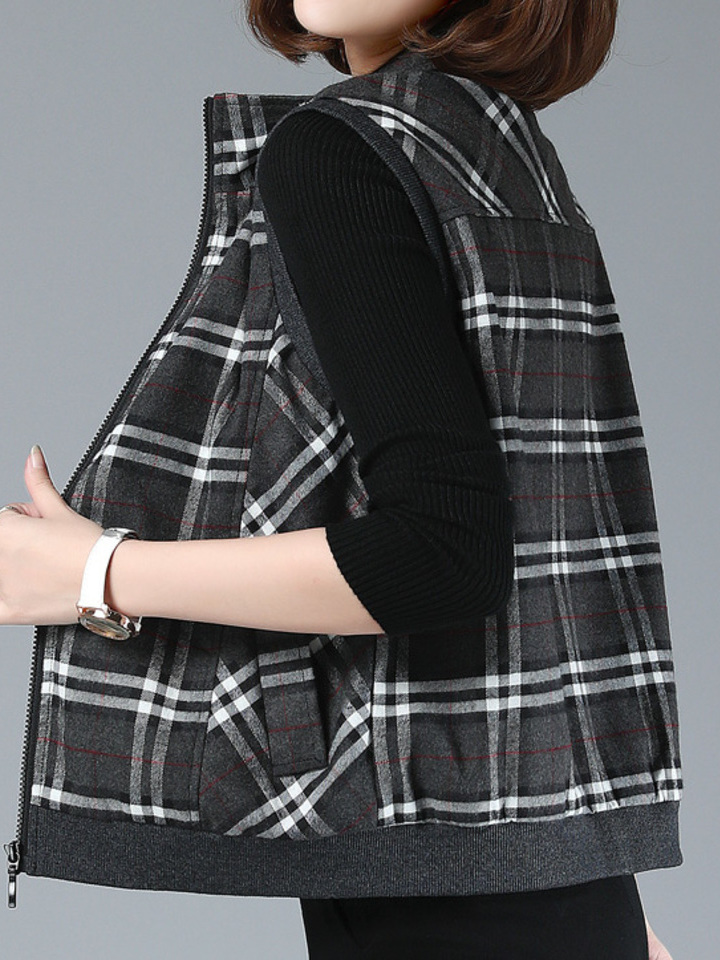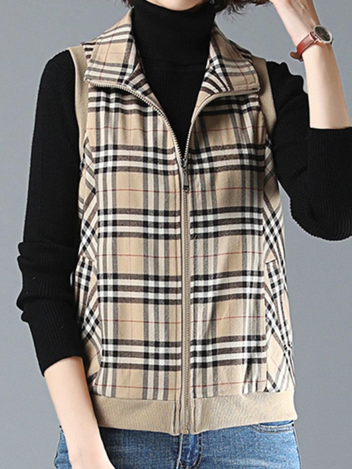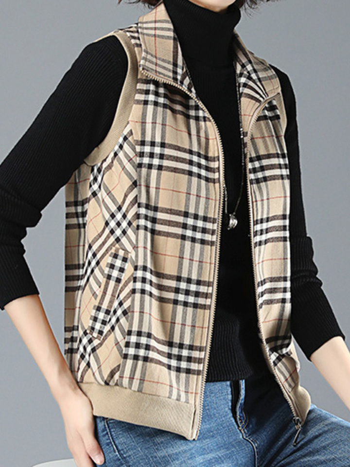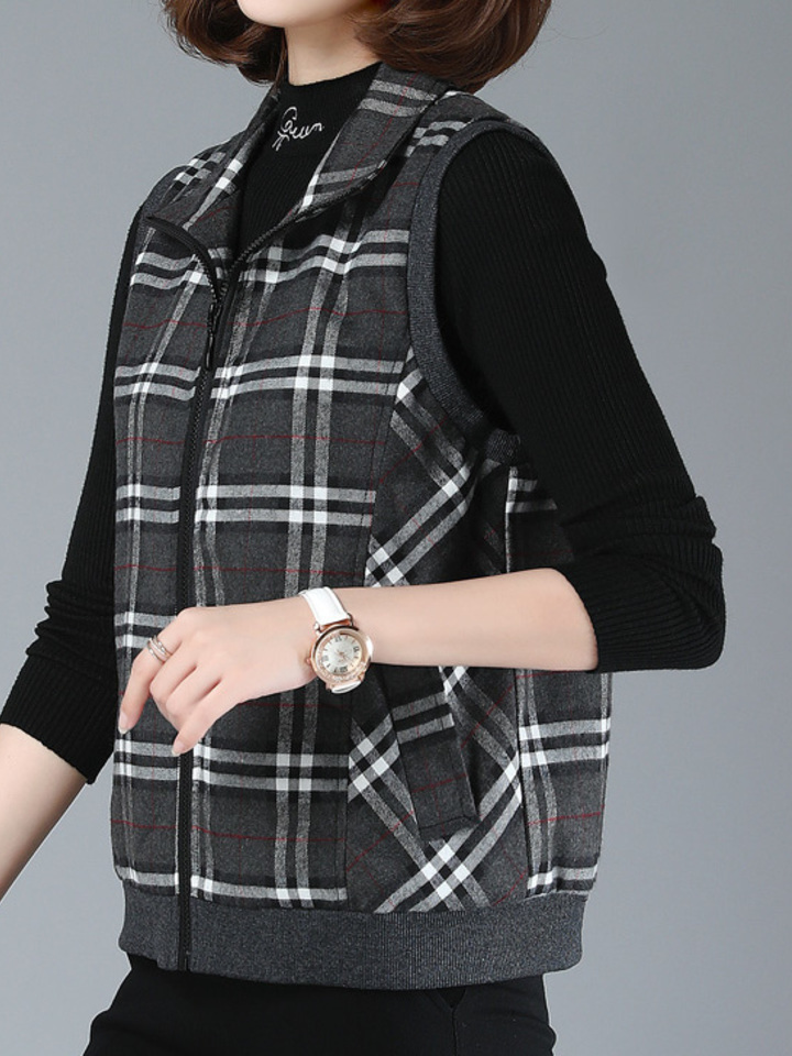 经典的格子设计,很有时尚范儿,加厚内里舒适又保暖,帅气的无袖马甲版型,搭配毛衣,卫衣穿,都很好看,是妈妈们秋季必备的一款简约外套。